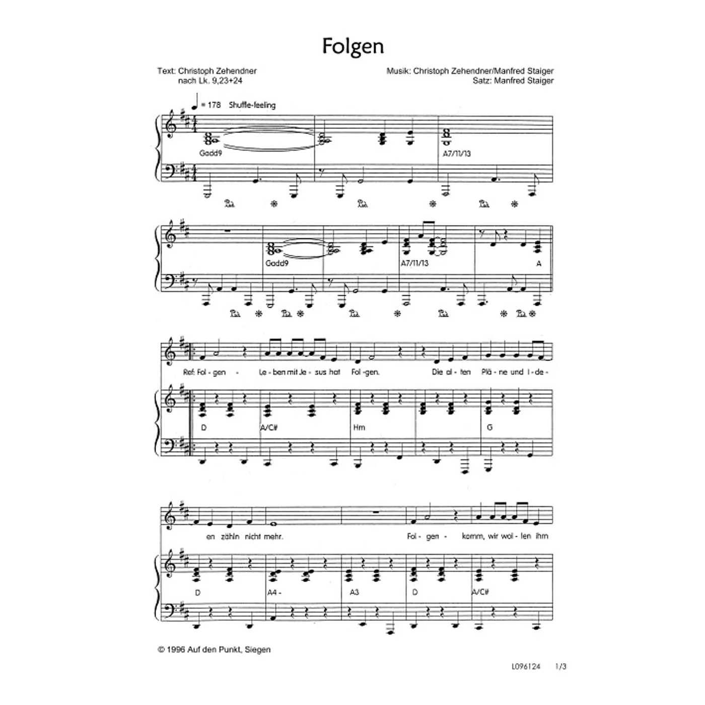 Folgen (modern, einstimmig, mit Akkorden, D-Dur) Manfred Staiger (Komposition), Christoph Zehendner (Komposition, Text) | modern, einstimmig, mit Akkorden, D-Dur | 1,50 € | ||