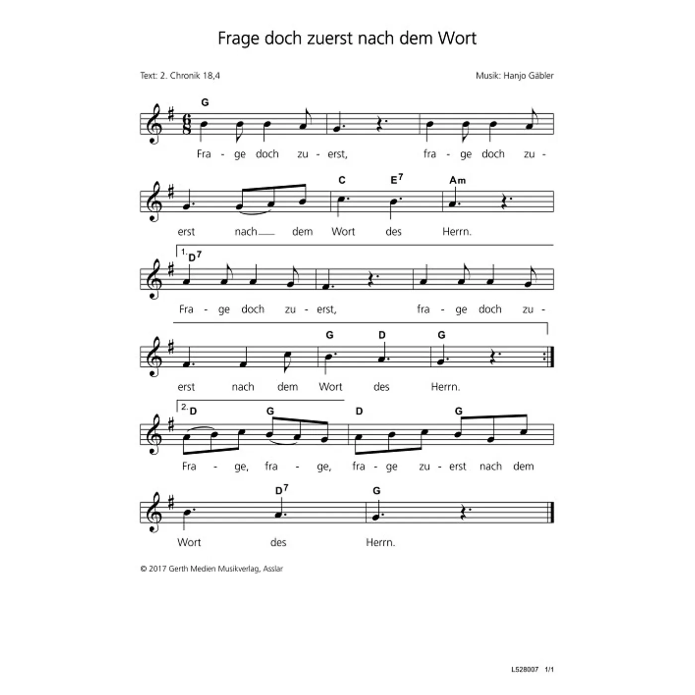 Frage doch zuerst nach dem Wort (diese Variante haben Sie gerade ausgewählt) (einstimmig, mit Akkorden, G-Dur) Hanjo Gäbler (Komposition) |