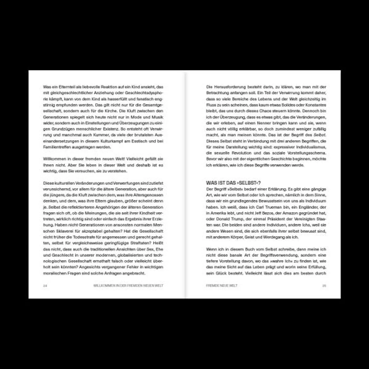 Carl R. Trueman, Professor für biblische und religionswissenschaftliche Studien am Grove City College im US-Bundesstaat Pennsylvania, hilft mit seinem Buch „Fremde neue Welt“, diese Entwicklungen besser einzuordnen. Nur wenige wissen, dass diese Entwicklungen u. a. bis auf die Philosophen und Religionskritiker René Descartes, Jean-Jacques Rousseau, Friedrich Nietzsche, Karl Marx und Sigmund Freud zurückgehen.