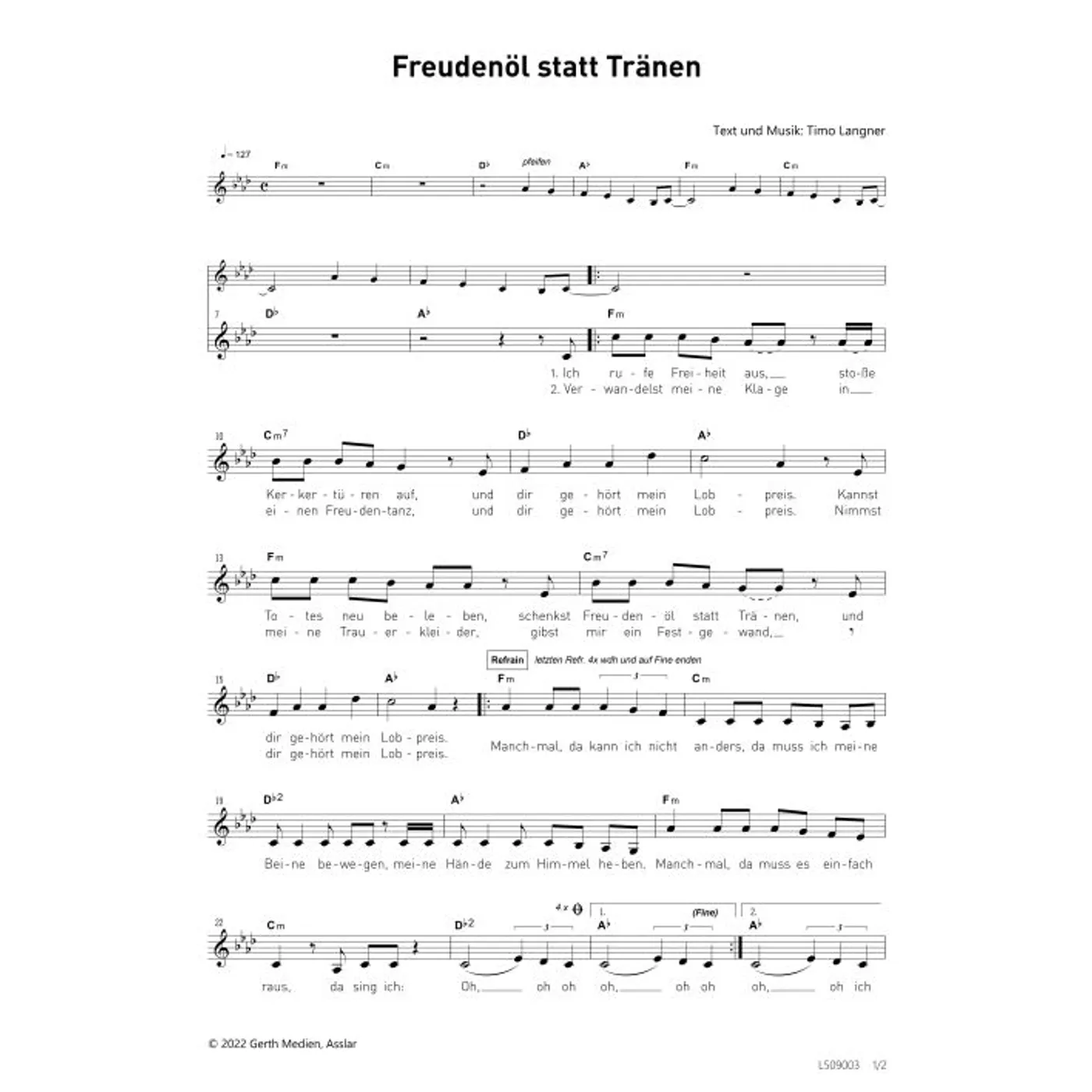 Freudenöl statt Tränen (diese Variante haben Sie gerade ausgewählt) (einstimmig, mit Akkorden, F-Moll) Timo Langner (Komposition, Text) |