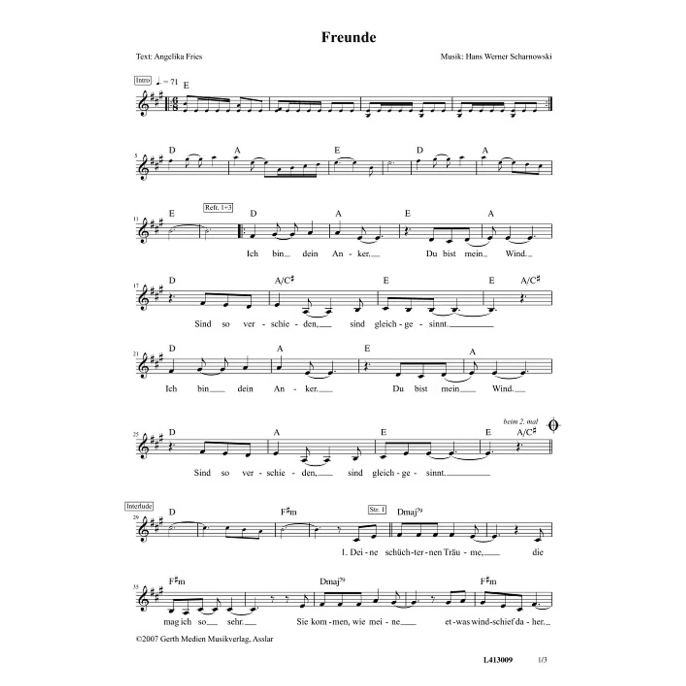 Freunde (diese Variante haben Sie gerade ausgewählt) (Solostimme, einstimmig, mit Akkorden) Hans Werner Scharnowski (Komposition), Angelika Fries (Text) |