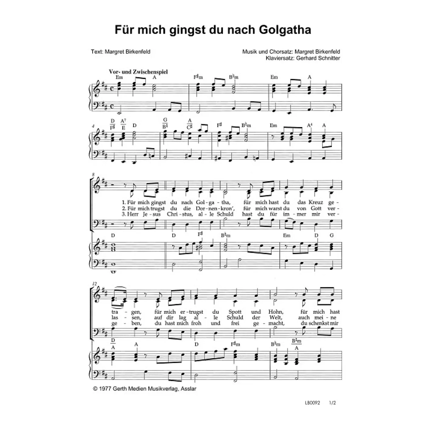 Für mich gingst du nach Golgatha (diese Variante haben Sie gerade ausgewählt) (traditionell, Frauenchor, Klavier, dreistimmig, mit Akkorden, D-Dur) Margret Birkenfeld (Komposition, Text), Gerhard Schnitter (Bearbeiter) |
