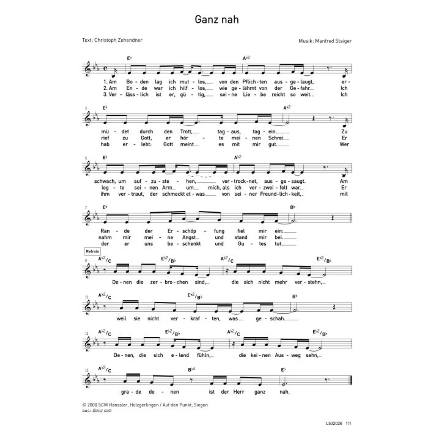 Ganz nah (diese Variante haben Sie gerade ausgewählt) (modern, einstimmig, mit Akkorden, Es-Dur) Manfred Staiger (Komposition), Christoph Zehendner (Text) |