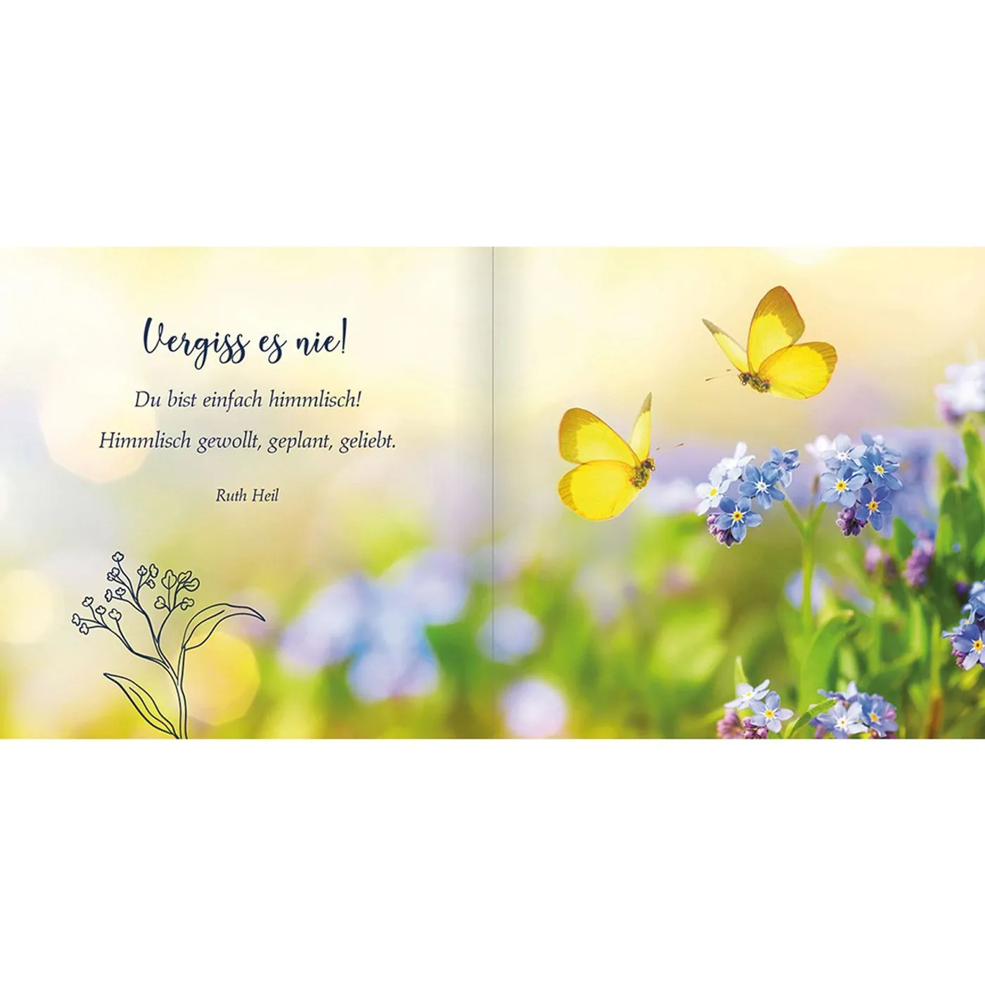 Im Format von 10,5 cm x 10,5 cm und mit 32 Seiten ist es ein kleines Buch, doch die Aufmachung ist wunderschön gestaltet. Blumen und Pflanzen bilden den Schwerpunkt der Illustrationen. Jede Doppelseite enthält einen Spruch und ein Bild. Beides passt sowohl farblich als auch gestalterisch immer sehr gut zusammen.
