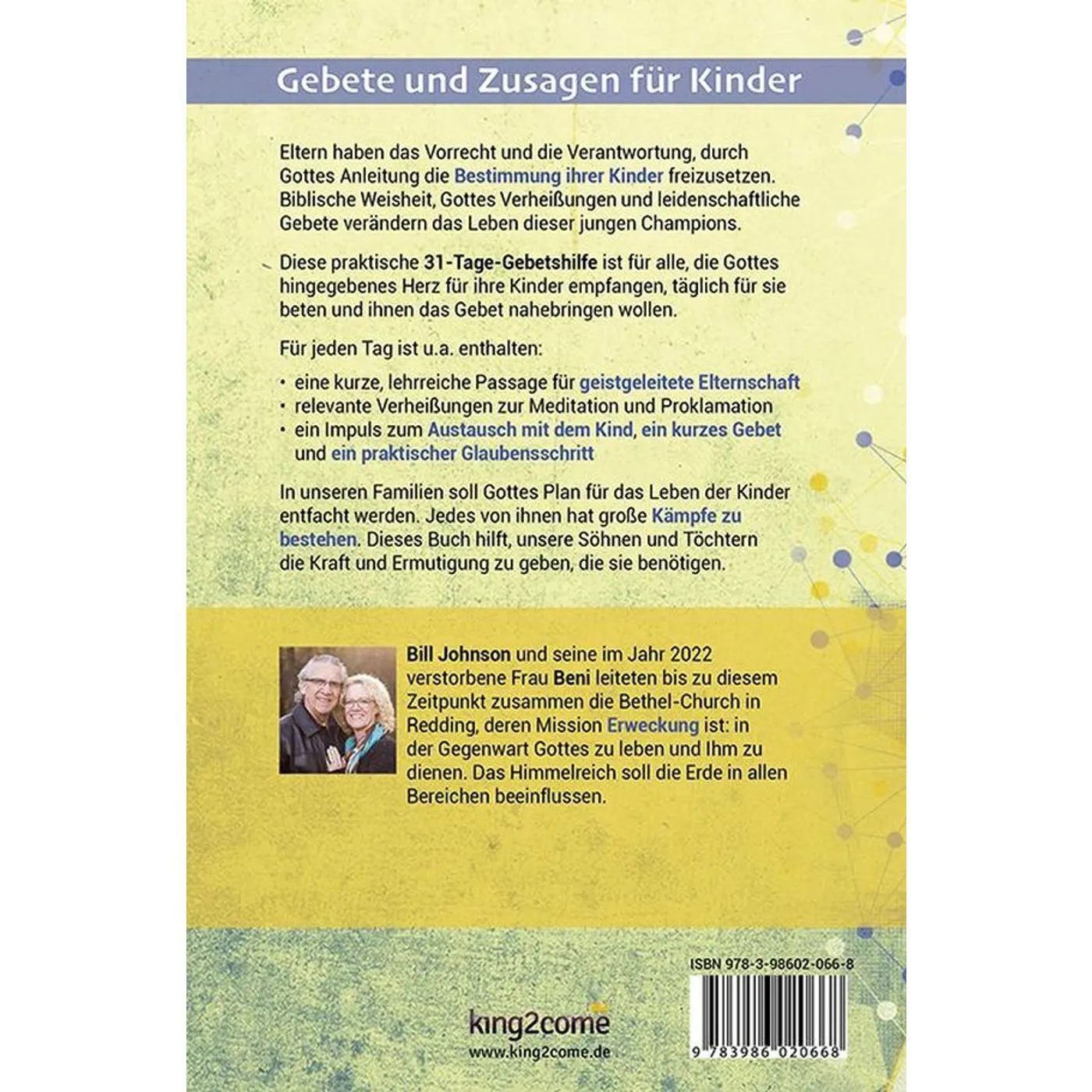 Eltern haben das Vorrecht und die Verantwortung, durch Gottes Anleitung die Bestimmung ihrer Kinder freizusetzen. Biblische Weisheit, Gottes Verheißungen und leidenschaftliche Gebete verändern das Leben dieser jungen Champions. Diese praktische 31-Tage-Gebetshilfe ist für alle, die Gottes hingegebenes Herz für ihre Kinder empfangen, täglich für sie beten und ihnen das Gebet nahebringen wollen. Für jeden Tag ist u.a. enthalten: