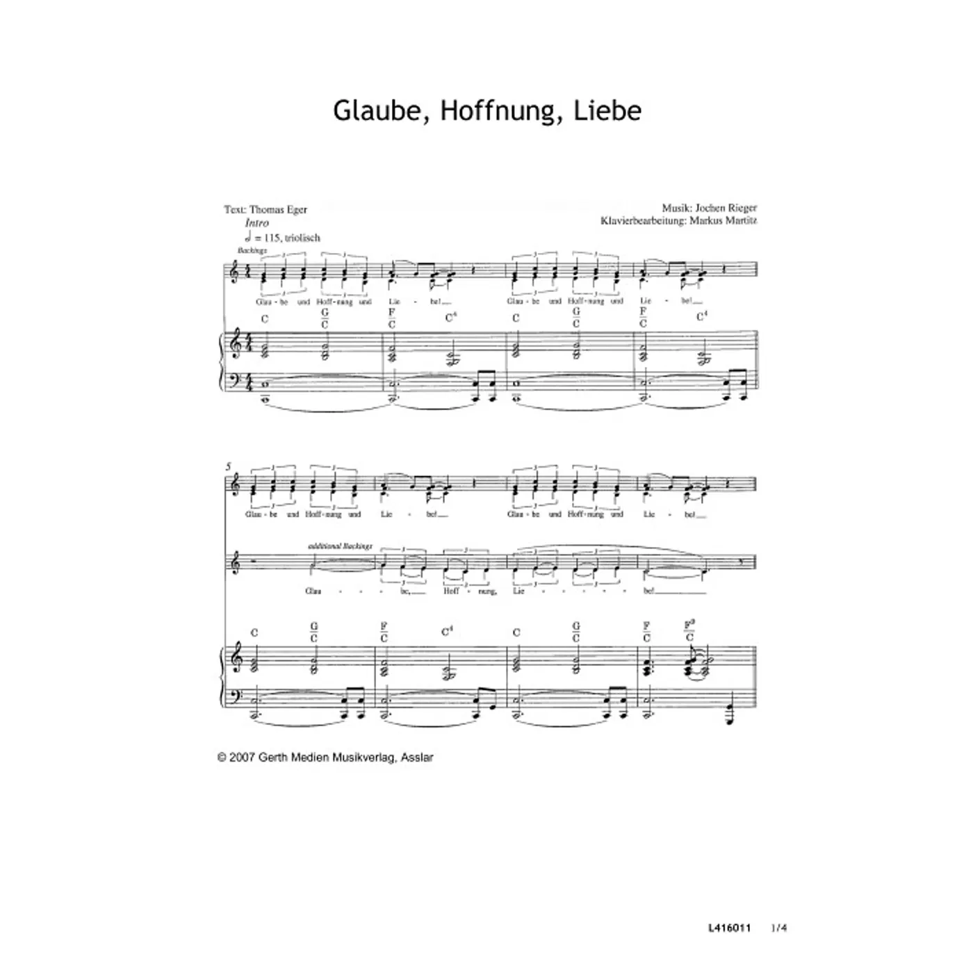 Glaube, Hoffnung, Liebe (diese Variante haben Sie gerade ausgewählt) (modern, Klavier, gemischter Chor, vierstimmig, C-Dur) Jochen Rieger (Komposition), Thomas Eger (Text), Markus Martitz (Bearbeiter) |