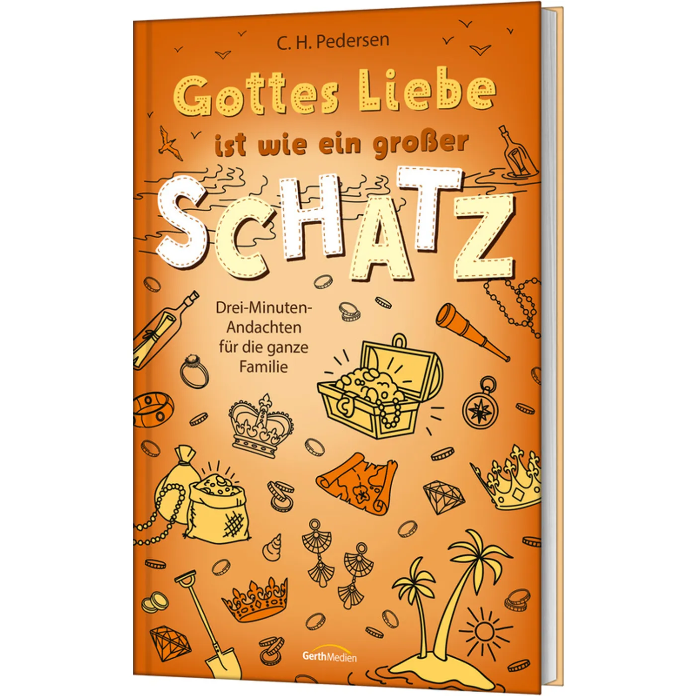 „Gottes Liebe ist wie ein großer Schatz“ von C.H. Pedersen ist ein sehr schönes Andachtsbuch für die ganze Familie. Schon das Cover in Orange-, Gelb- und Goldtönen mit den vielen kleinen Zeichnungen wirkt wie ein Schatz und passt wunderbar zum Titel.