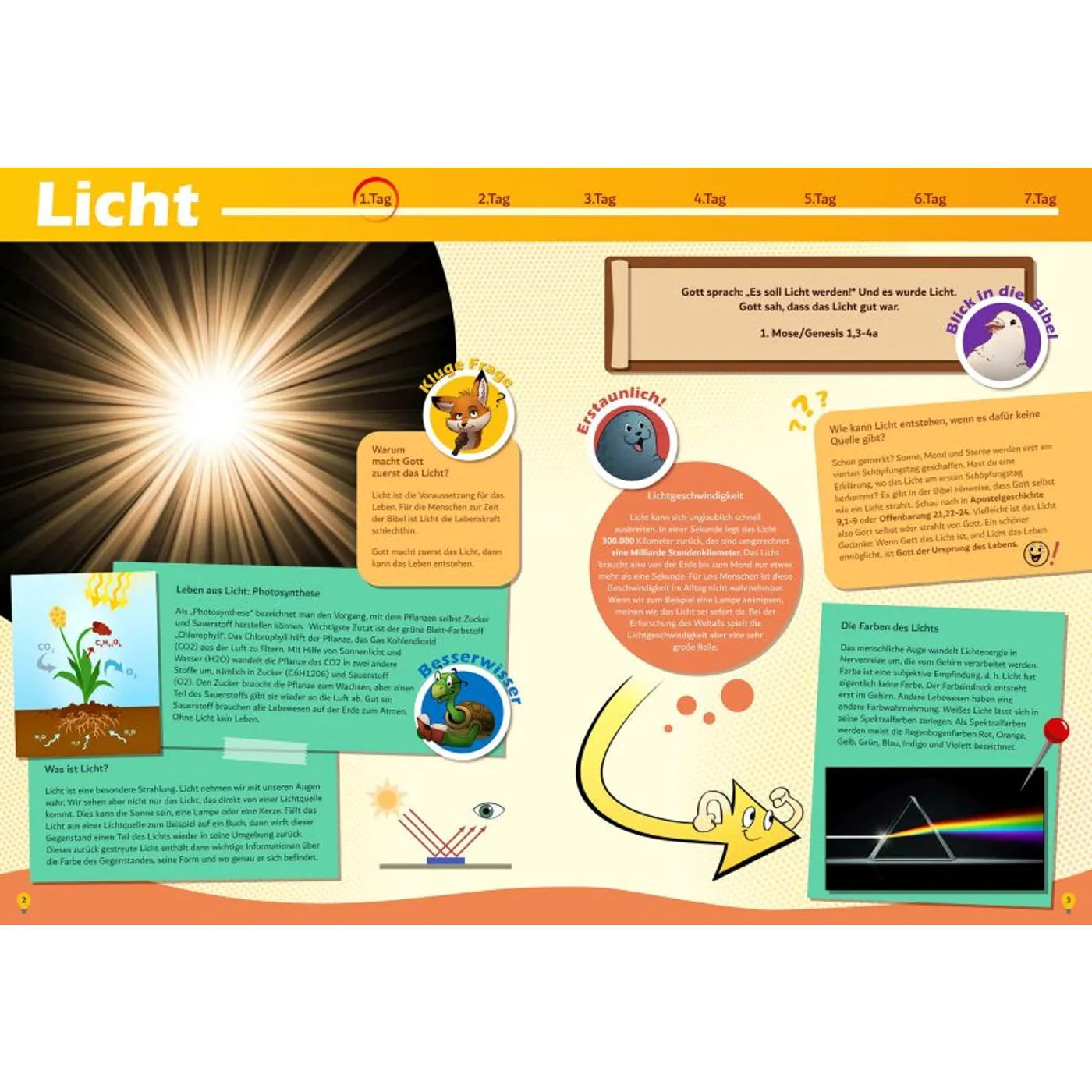 Die Aufmachung des Buches hat mir sehr gut gefallen. Es ist wirklich groß und das bunte Cover laden direkt ein, das Buch zu entdecken. Zu Beginn werden fünf Tiere vorgestellt, die den Leser durch das Buch begleiten. Jedes Tier deckt einen Wissensbereich ab, zum Beispiel erstaunliche Fakten, einen Blick in die Bibel oder Mitmachaktionen. Zu jedem Schöpfungstag gibt es mehrere Seiten mit Informationen zu dem jeweiligen Geschaffenen. Die wirklich vielfältigen Informationen werden von Fotos und tollen gemalten Illustrationen begleitet. Wirklich gut gefallen haben mir die vielen Bezüge zur Bibel. Aber auch die Mitmachaktionen bieten eine tolle praktische Ergänzung zum Sachwissen, auch wenn sich manche der Ideen nur mit Hilfe der Eltern umsetzen lassen.