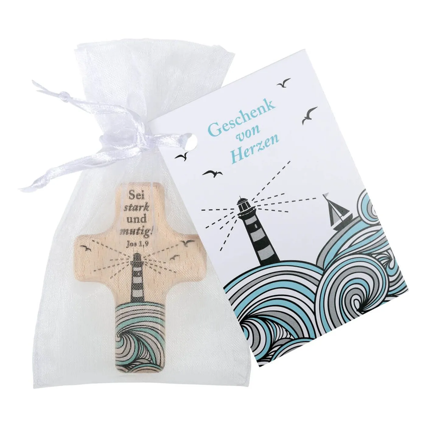 Bedruckt mit Leuchturm und Spruch: Sei stark und mutig!
