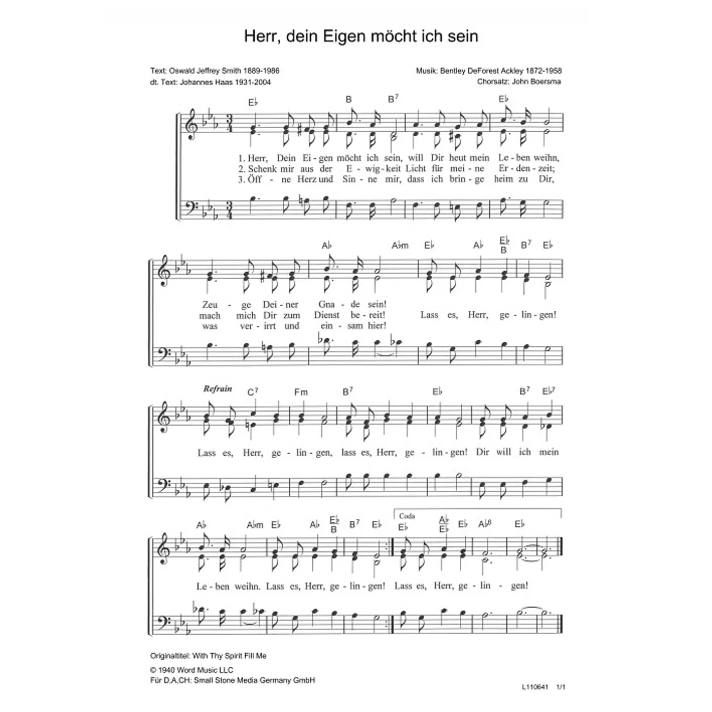 Herr, dein Eigen möcht ich sein Herr, dein Eigen möcht ich sein (traditionell, Klavier, gemischter Chor, mit Akkorden, vierstimmig, Es-Dur) Bentley DeForest Ackley (Komposition), Oswald Jeffrey Smith (Text), John Boersma (Chorsatz), Johannes Haas (Übersetzung) traditionell, Klavier, gemischter Chor, mit Akkorden, vierstimmig, Es-Dur 2,80 €