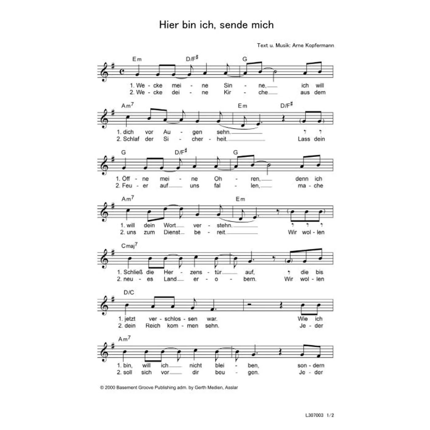 Hier bin ich, sende mich (diese Variante haben Sie gerade ausgewählt) (modern, einstimmig, mit Akkorden, E-Moll) Arne Kopfermann (Komposition, Text) |