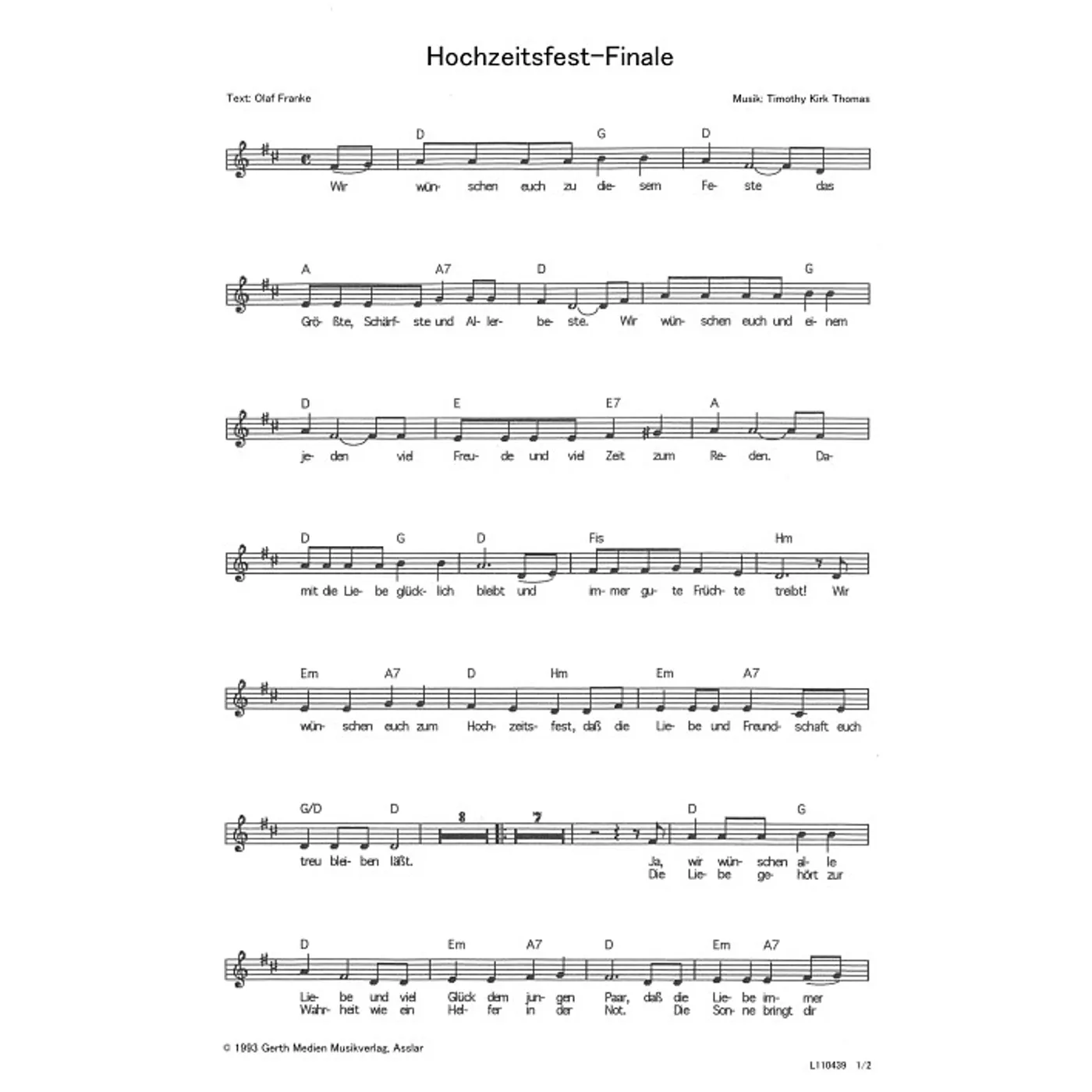 Hochzeitsfest-Finale (diese Variante haben Sie gerade ausgewählt) (Kinderchor, einstimmig, mit Akkorden, D-Dur) Tim Thomas (Komposition), Olaf Franke (Text) |