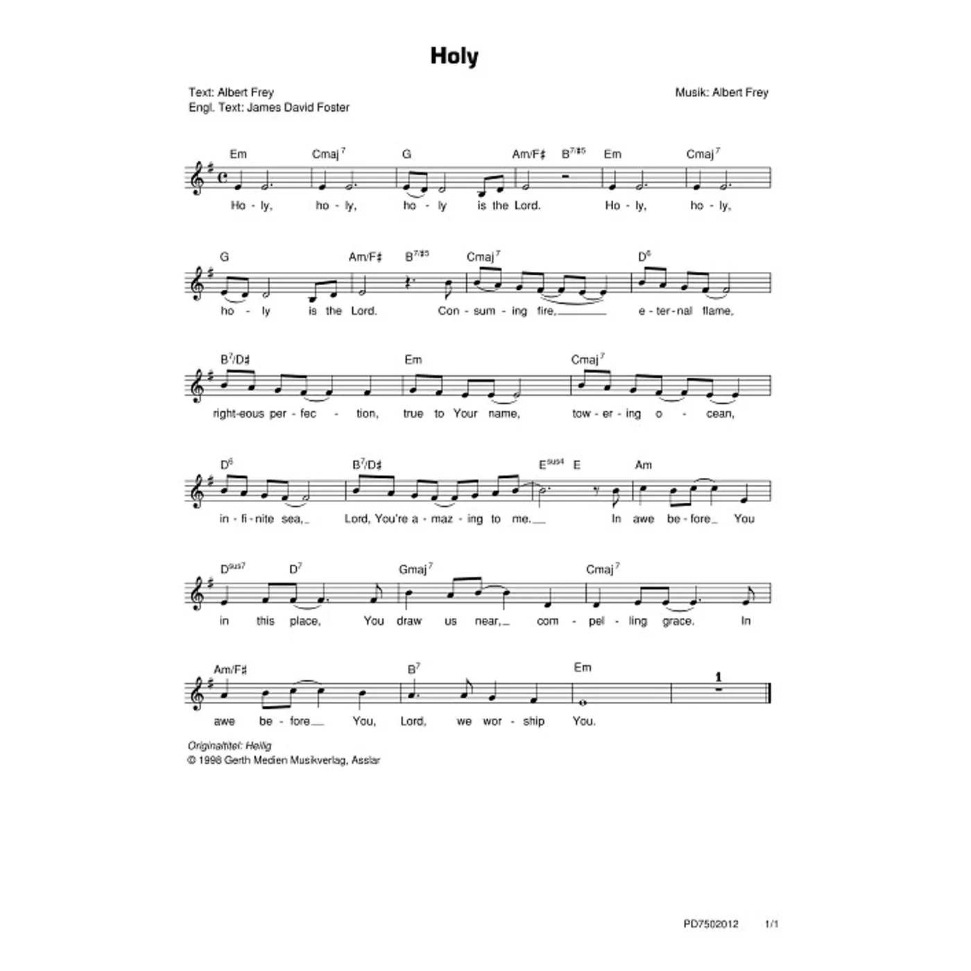 Holy (diese Variante haben Sie gerade ausgewählt) (einstimmig, mit Akkorden, E-Moll) Albert Frey (Komposition, Text), James David Foster (Übersetzung) |
