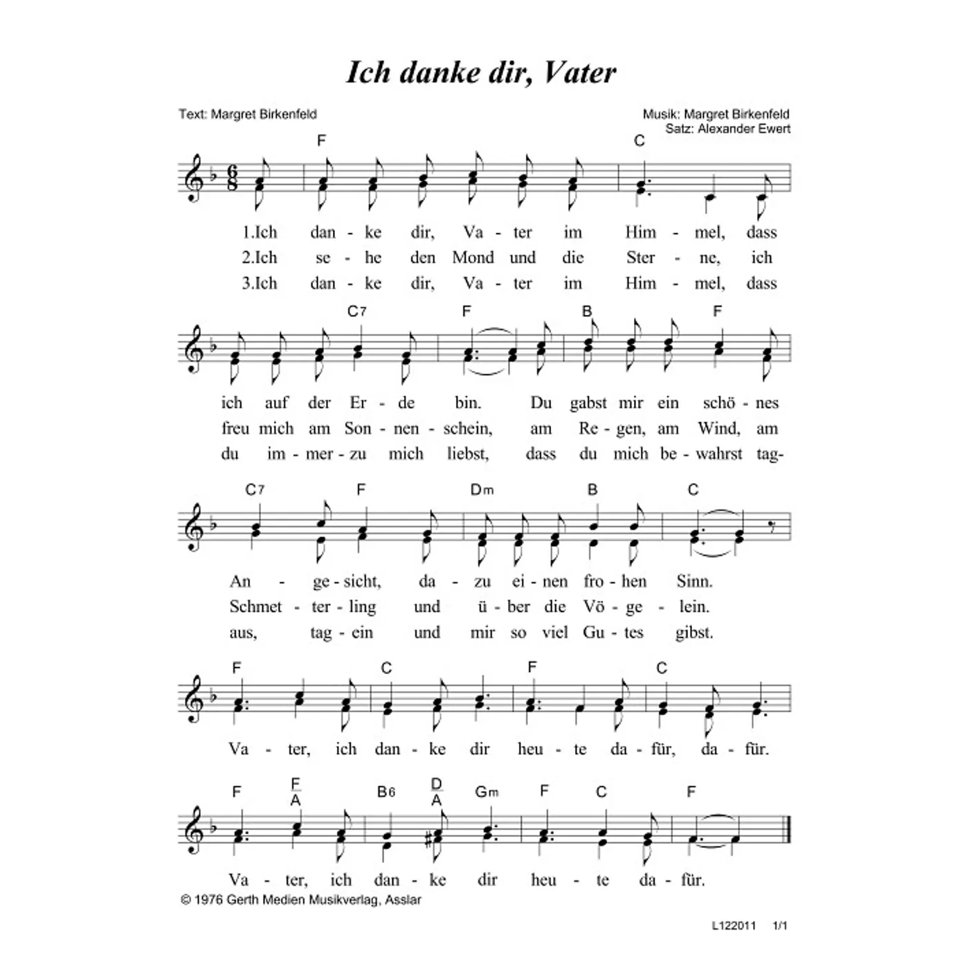 Ich danke dir, Vater (diese Variante haben Sie gerade ausgewählt) (Kinderchor, mit Akkorden, zweistimmig, F-Dur) Margret Birkenfeld (Komposition, Text), Alexander Ewert (Bearbeiter) |
