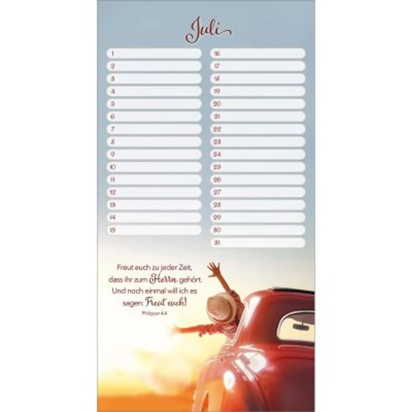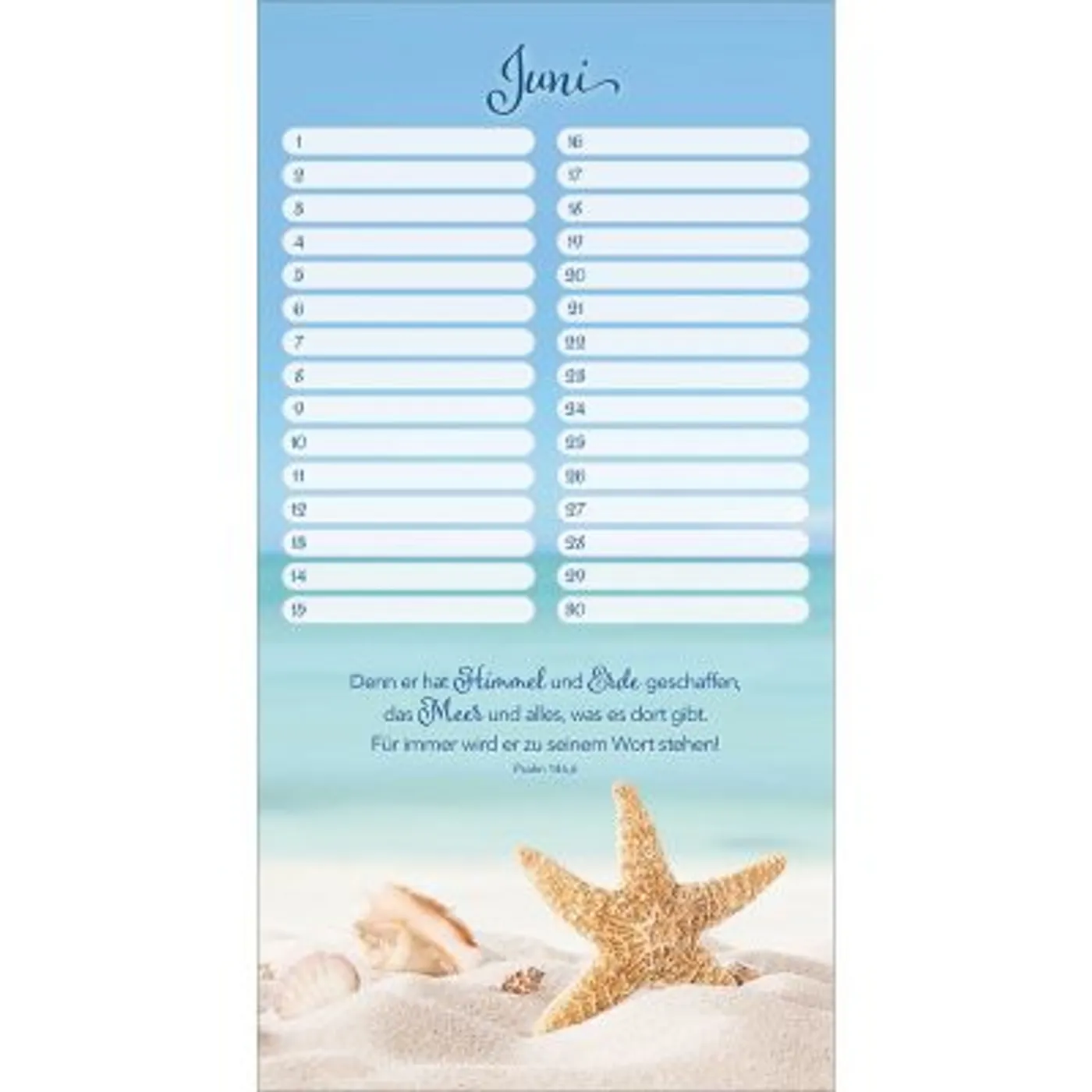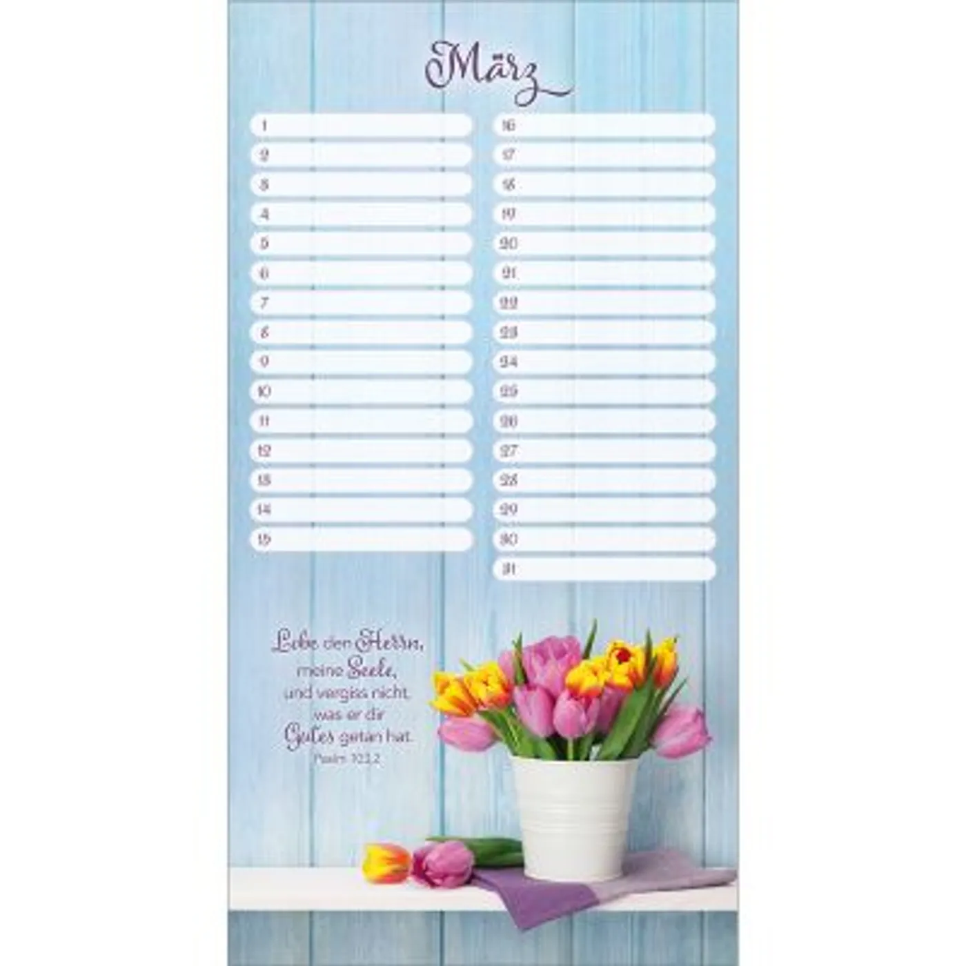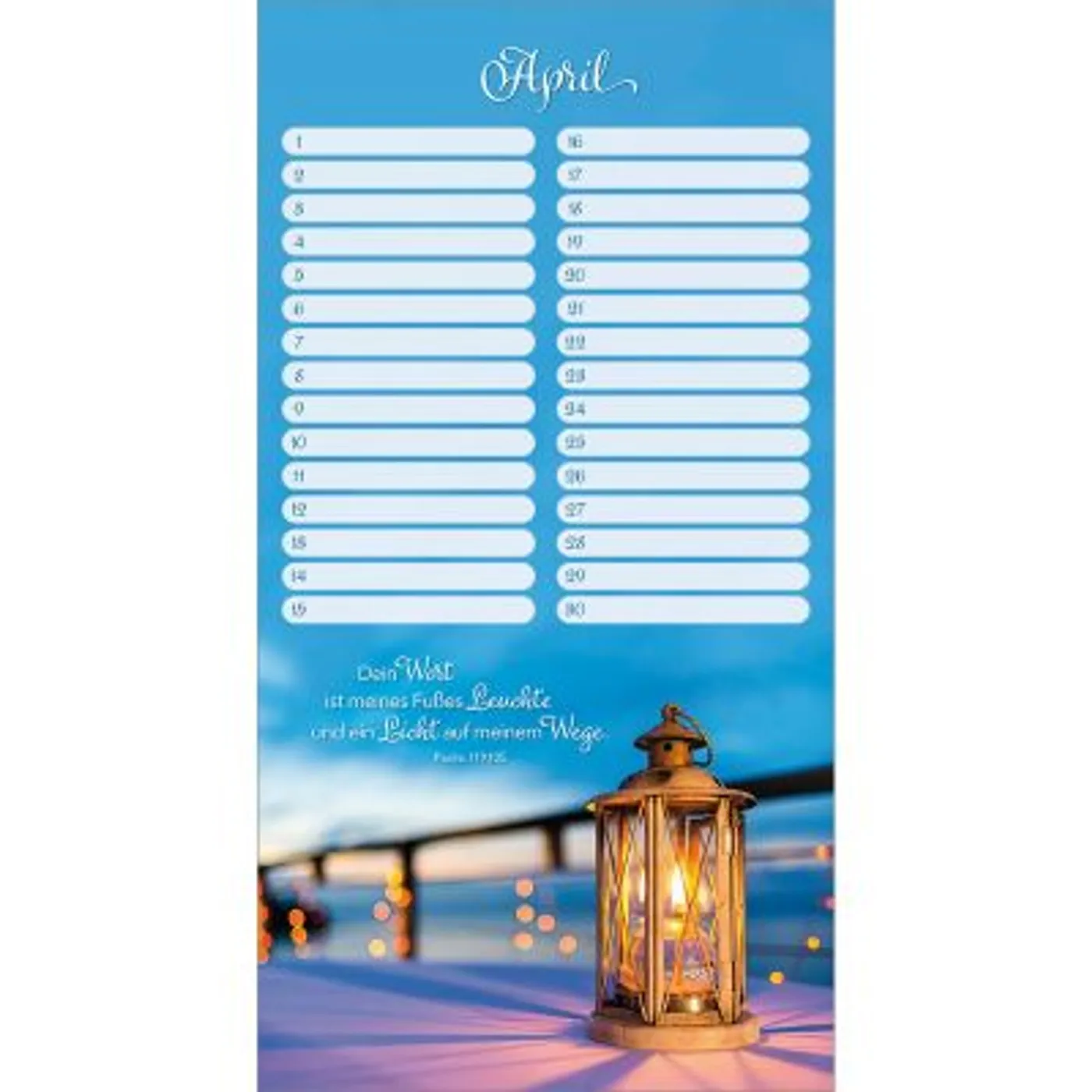 Mit diesem wunderschönen Wandkalender vergessen Sie nie wieder Geburts- und Jahrestage. Stimmungsvolle Bilder mit wertvollen Bibelversen begleiten Sie jedes Jahr aufs Neue und sind im praktischen Hochformat ein echter Blickfang. Zusätzlich gibt es genügend Spalten um alle Geburts-, Fest- oder Trauertage von Freunden und Verwandten einzutragen. Dieser Kalender ist somit nicht nur praktisch, sondern auch sehr dekorativ und ermutigend. Ein wertvoller Begleiter für viele Jahre.
