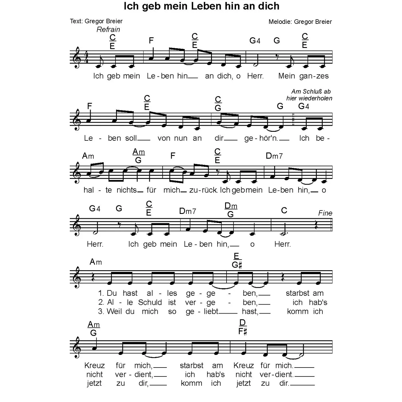 Ich geb mein Leben hin an dich (diese Variante haben Sie gerade ausgewählt) (Neuere Gemeindelieder, einstimmig, C-Dur, Andante (104), Viertel) Gregor Breier (Text, Melodie) |