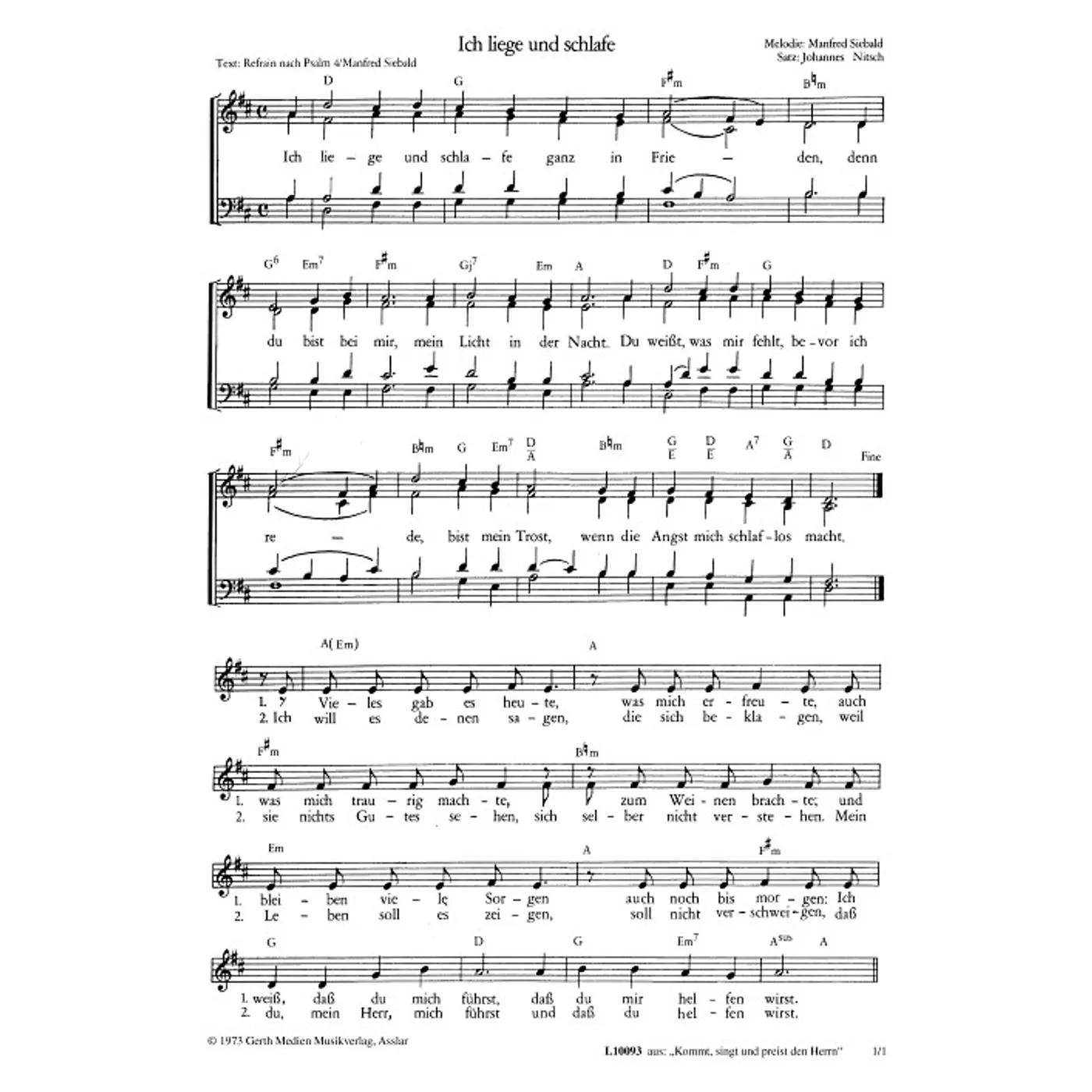 Ich liege und schlafe (diese Variante haben Sie gerade ausgewählt) (traditionell, gemischter Chor, mit Akkorden, vierstimmig, D-Dur) Manfred Siebald (Komposition, Text), Johannes Nitsch (Chorsatz) |