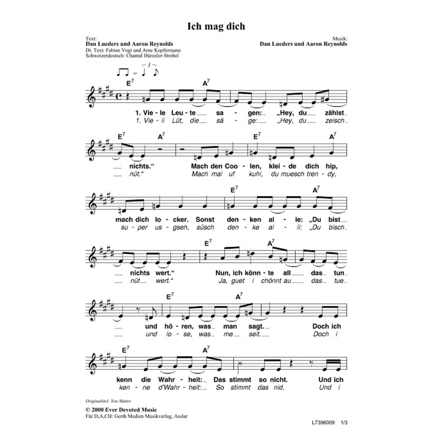 Ich mag dich (diese Variante haben Sie gerade ausgewählt) (Solostimme, einstimmig, mit Akkorden, E-Dur) Dan Lueders (Komposition, Text), Aaron Reynolds (Komposition, Text), Chantal Hürzeler-Strebel, Arne Kopfermann, Fabian Vogt |