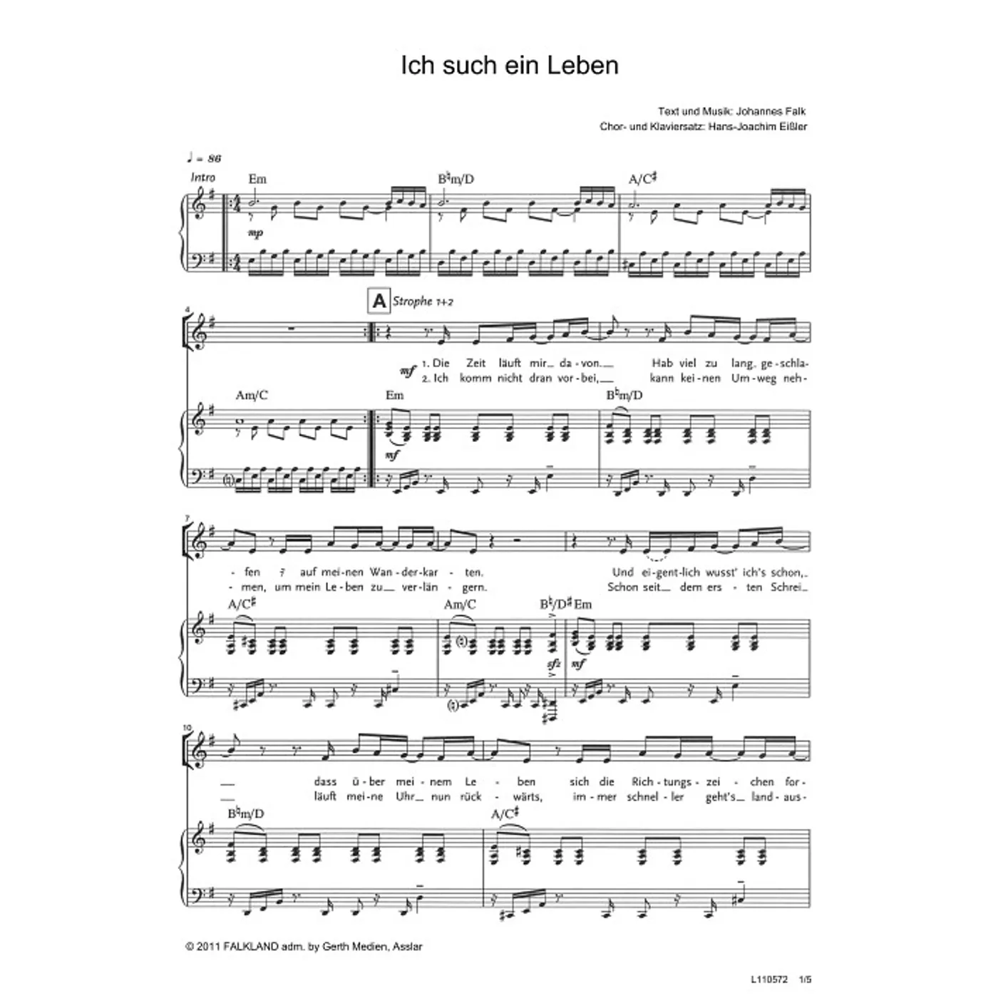 Ich such ein Leben (diese Variante haben Sie gerade ausgewählt) (modern, Klavier, gemischter Chor, mit Akkorden, vierstimmig, E-Moll) Johannes Falk (Komposition, Text), Hans-Joachim Eißler (Klaviersatz) |
