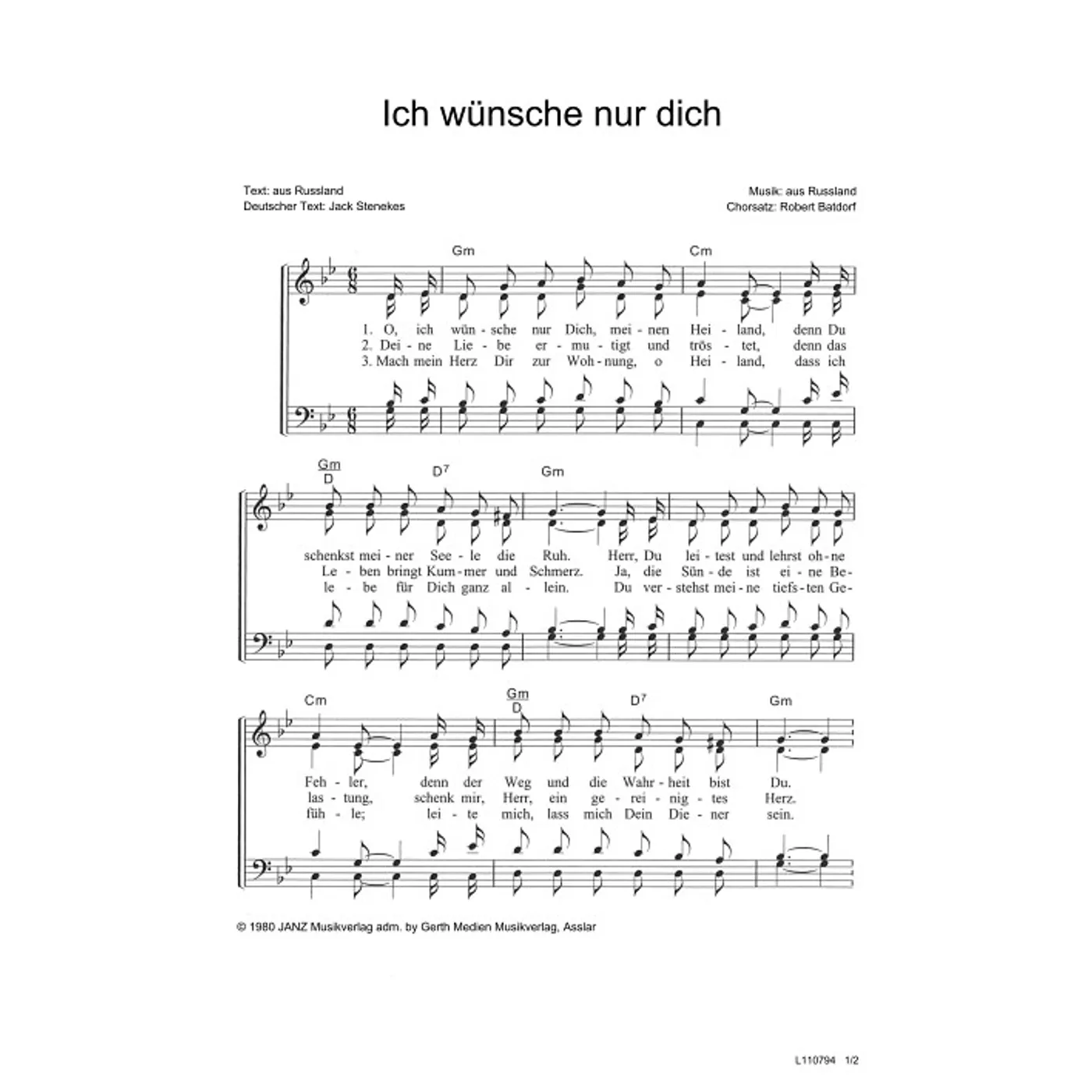 Ich wünsche nur dich, Herr (diese Variante haben Sie gerade ausgewählt) (traditionell, gemischter Chor, mit Akkorden, vierstimmig, G-Moll) Robert Batdorf (Chorsatz), Jack Stenekes (Übersetzung) |