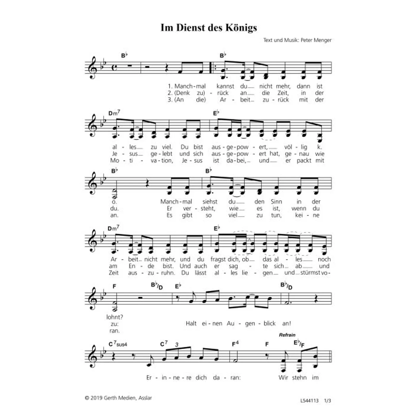 Im Dienst des Königs (Gemeindelied, modern, einstimmig, mit Akkorden, B-Dur) Peter Menger (Komposition, Text) | Gemeindelied, modern, einstimmig, mit Akkorden, B-Dur | 1,50 € | ||