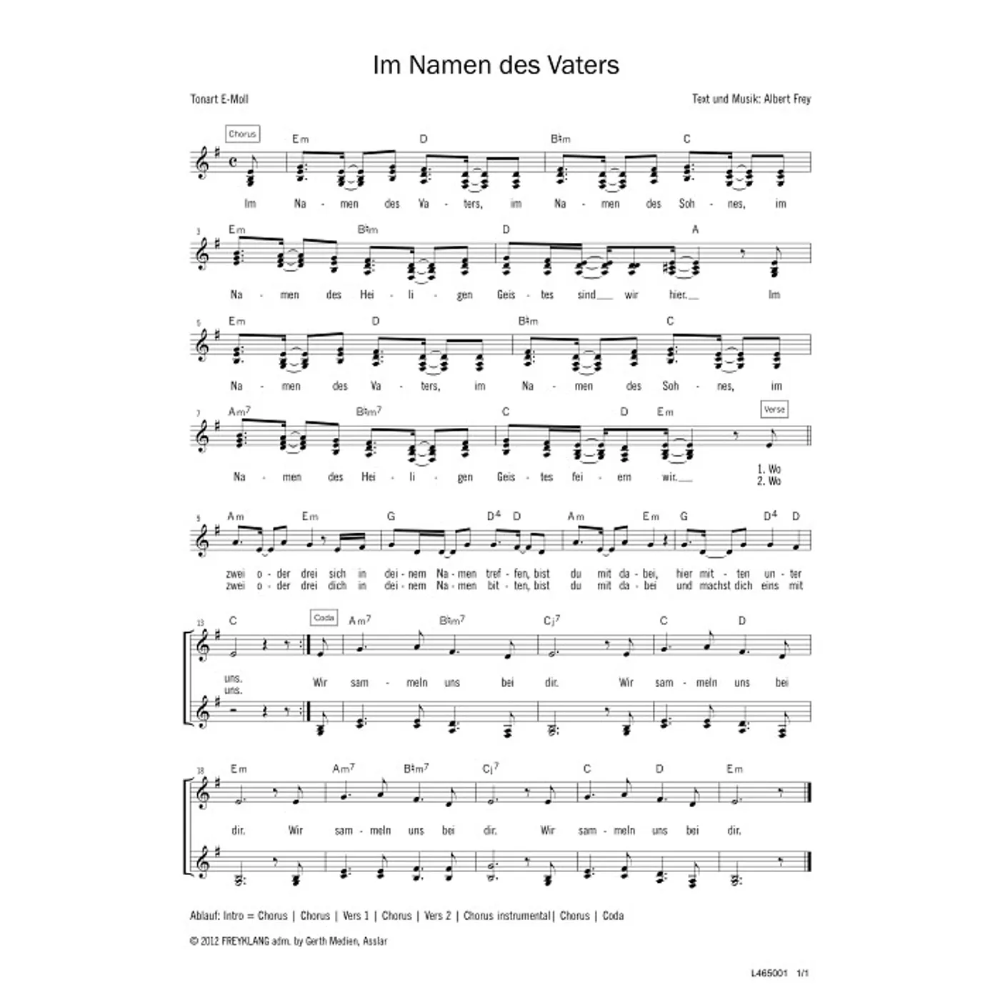 Im Namen des Vaters (diese Variante haben Sie gerade ausgewählt) (Gemeindelied, dreistimmig, mit Akkorden, E-Moll) Albert Frey (Komposition, Text) |
