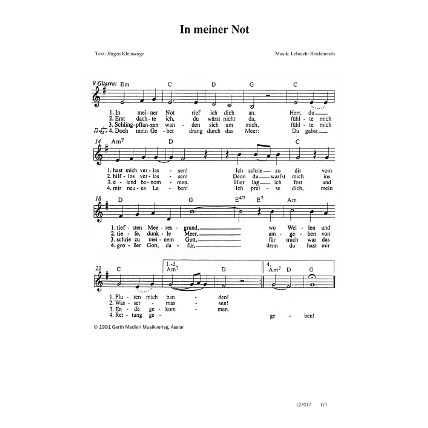 In meiner Not (diese Variante haben Sie gerade ausgewählt) (einstimmig, mit Akkorden, E-Moll) Lebrecht Heidenreich (Komposition), Jürgen Kleinsorge (Text) |