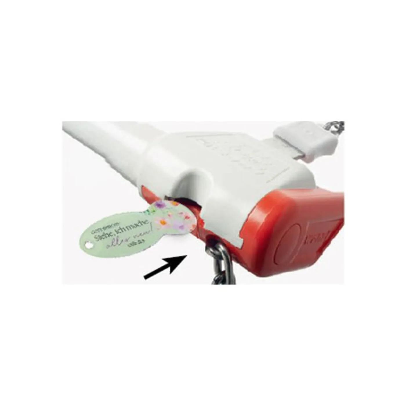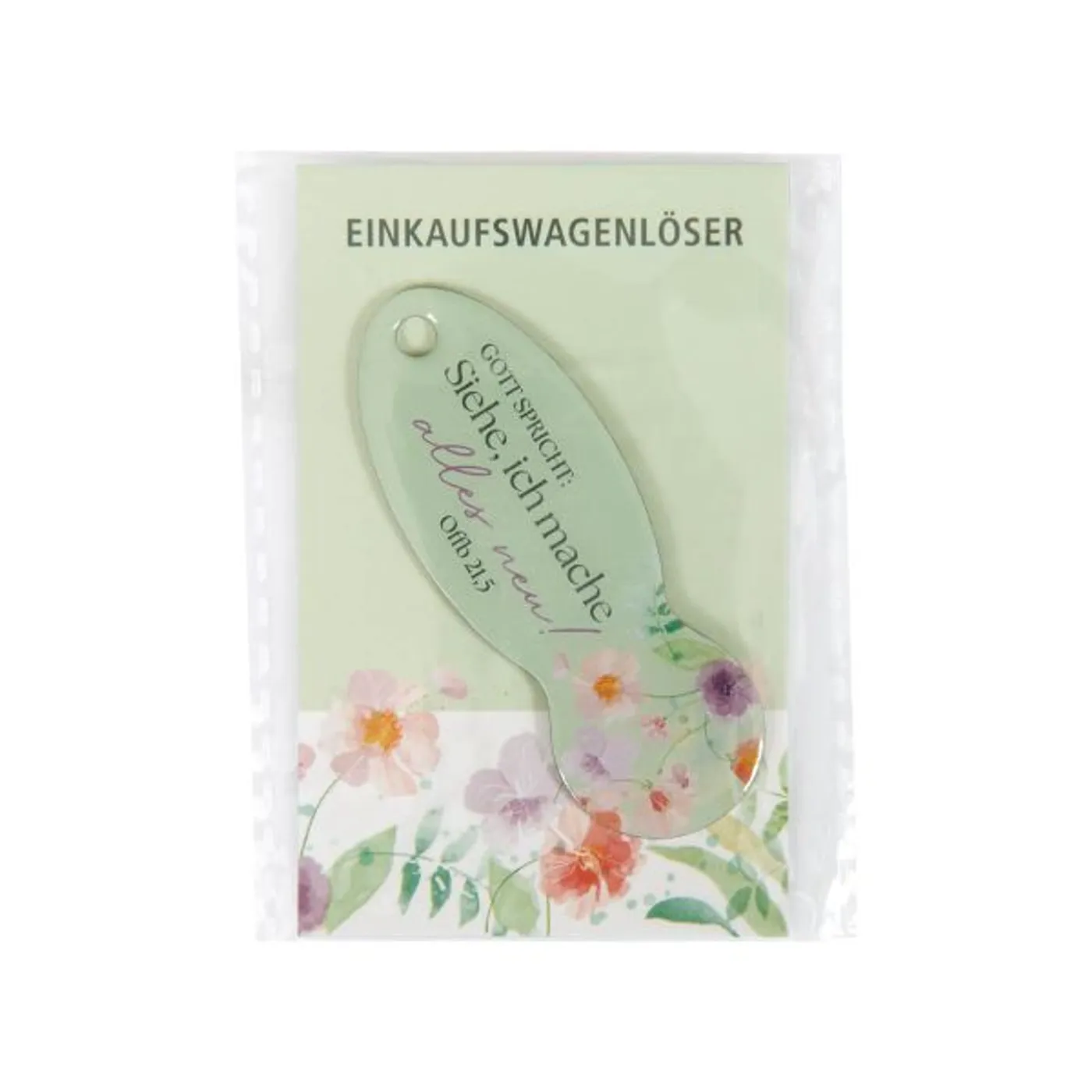 Der Einkaufswagenhelfer mit schönem Motiv Jahreslosung 2026 "Gott spricht: Siehe, ich mache alles neu! " bewahrt man am besten am Schlüsselbund auf.
