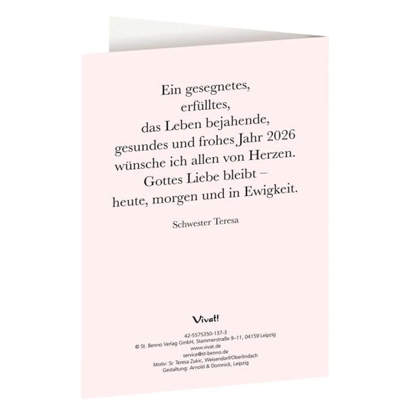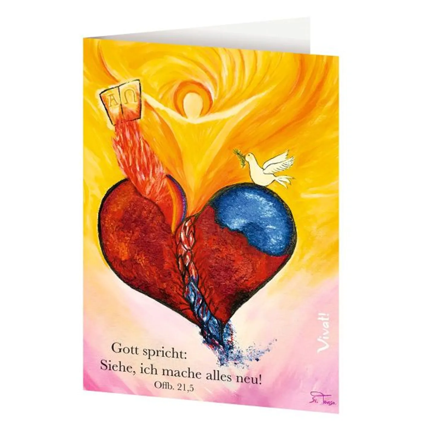 Gott spricht: „Siehe, ich mache alles neu“ heißt es am Ende der Bibel in der Offenbarung 21,5. Und so lautet auch das Motto für die Jahreslosung 2026. Die bekannte Autorin und Ordensfrau Schwester Teresa Zukic ist auch als Malerin aktiv. Sie hat die Botschaft in Farben und Symbolen gezeichnet. Das Gemälde zeigt u.a. einen gelben Engel hinter einem rotblauen Herzen und der weißen Taube. Zusammen mit dem Offenbarungs-Vers lädt das Bild ein, inne zu halten, um über das Ende der Welt und gleichzeitig über die Neuschöpfung nachzudenken, die Gott für die Menschen bereithält. Die Jahreslosung wird von der Ökumenischen Arbeitsgemeinschaft für Bibellesen für jedes Jahr als Leitvers ausgewählt.