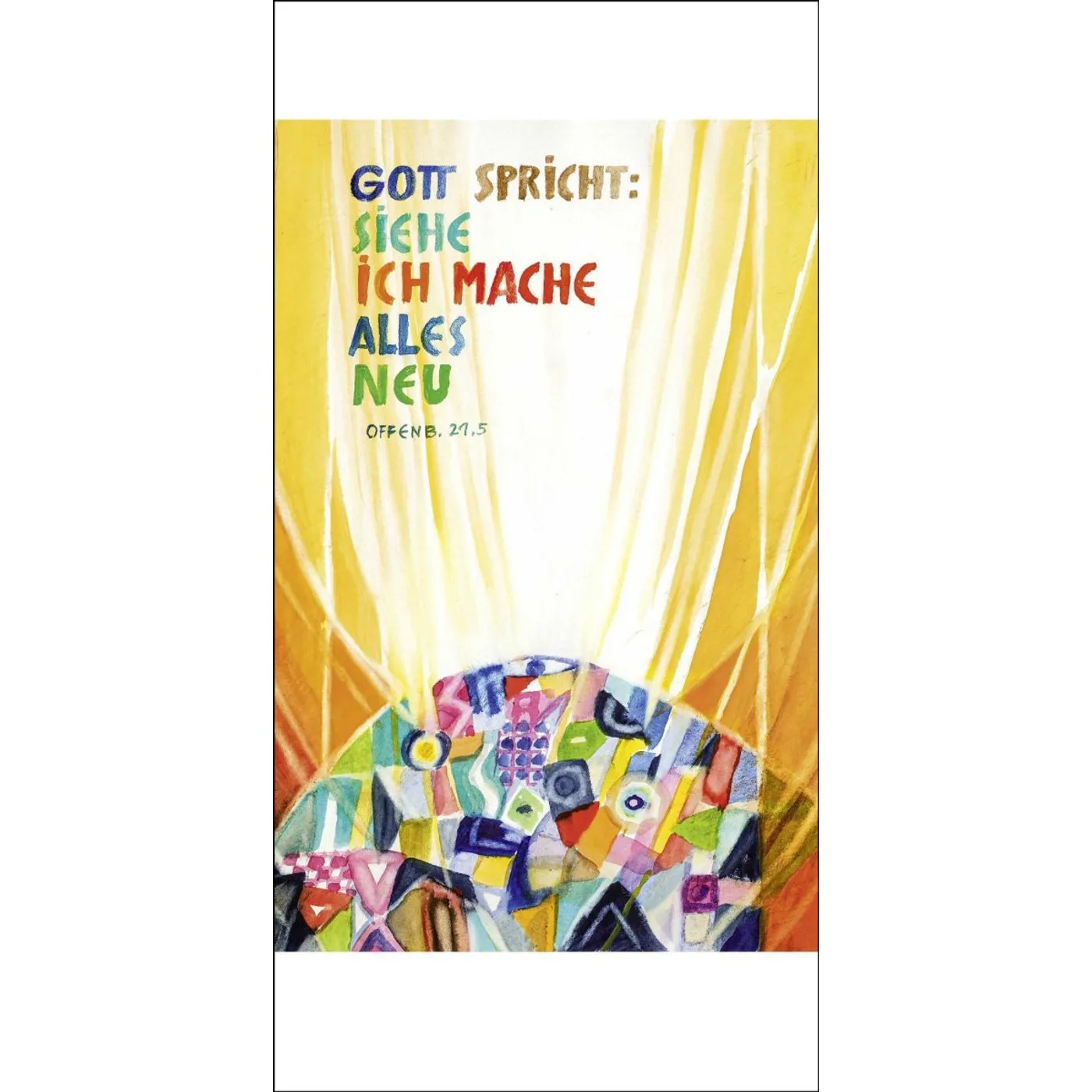 In einer Zeit voller gravierender Umbrüche und großer Unsicherheit spendet uns der Vers aus der Offenbarung des Johannes, dem einzigen prophetischen Buch des Neuen Testaments, das etwa 70 Jahre nach Christus auf der Insel Patmos entstanden ist, Trost und Hoffnung. In seinen sieben Sendschreiben an Gemeinden in Kleinasien beschreibt Johannes eine gewaltige Krise: Alles ist ins Wanken geraten, überall herrschen Not und Zerstörung, es wird immer schlimmer, das Leid ist riesig und die Lage scheinbar aussichtslos. In diese Situation hinein gibt Gott ein Versprechen: »Siehe ich mache alles neu!«.