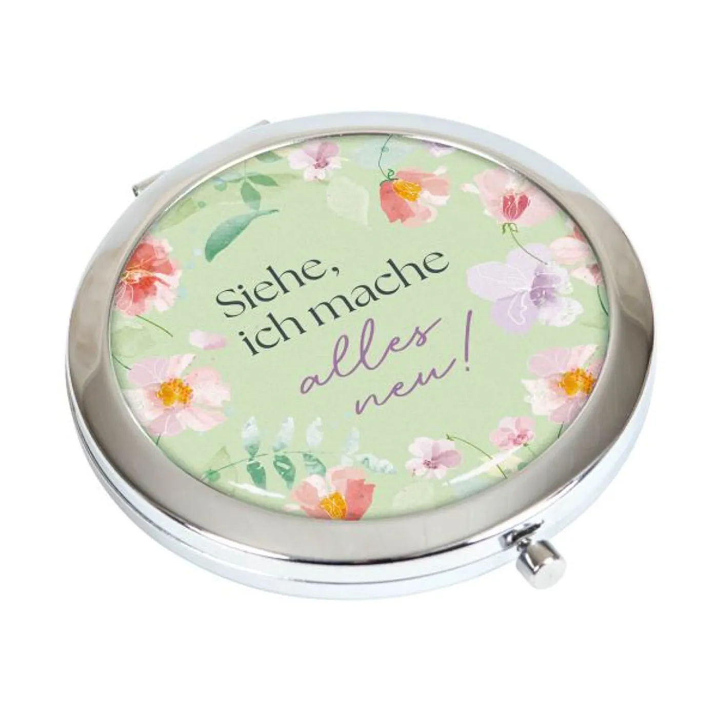 Edler und praktischer Taschenspiegel mit der Jahreslosung 2026: "Gott spricht: Siehe, ich mache alles neu!"