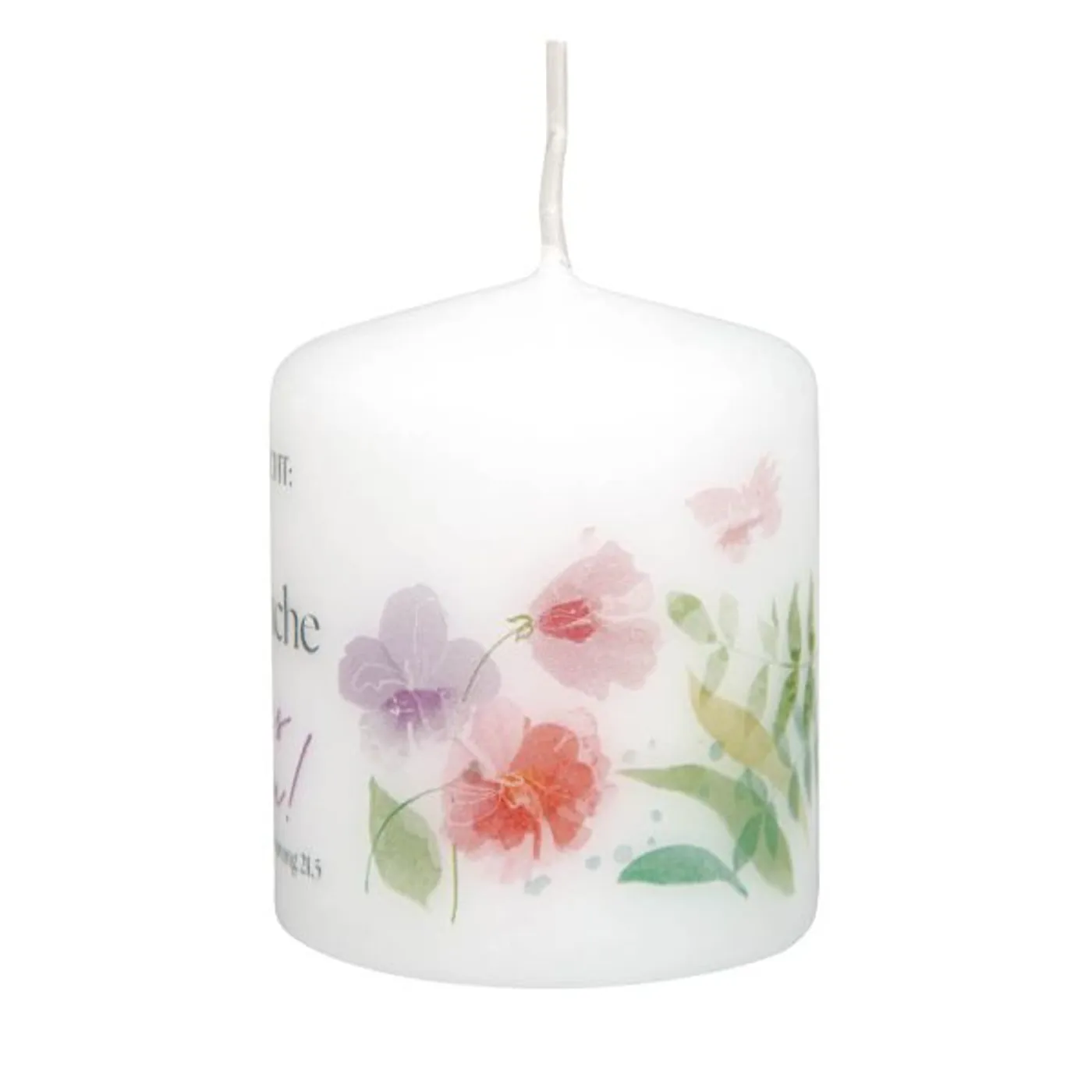Dekorative kleine Tischkerze mit rundum bedrucktem Jahreslosungsmotiv 2026.