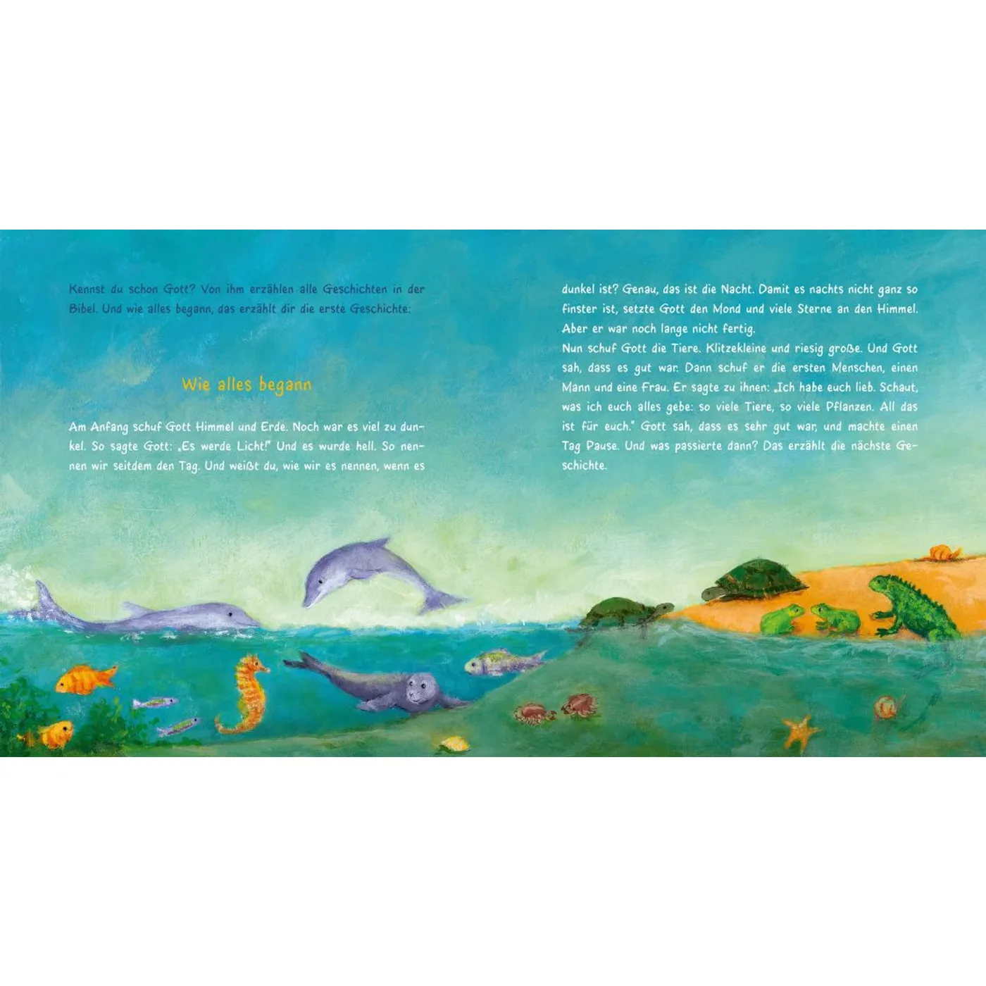 Von der Entstehung der Welt spannt sie den Bogen über die Geschichten von Noah, Abraham, David und Goliat und Jona bis ins Neue Testament zu Jesu Geburt, seinen Jüngern, dem gutem Hirten und der Geschichte über die wunderbare Brotvermehrung.