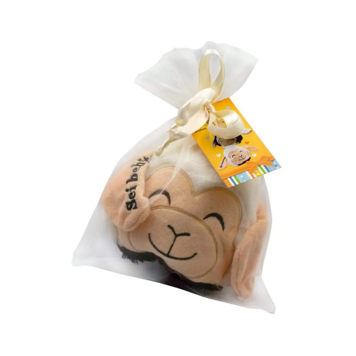 Fertig verpackt wird das Schäfchen in einem Organzabeutel als Geschenk geliefert. Daran ist ein liebevoll gestaltetes Schmuckkärtchen mit dem Aufdruck „Mein Schaf Flocke“ und „Sei behütet – Gott liebt dich so wie du bist“ befestigt.