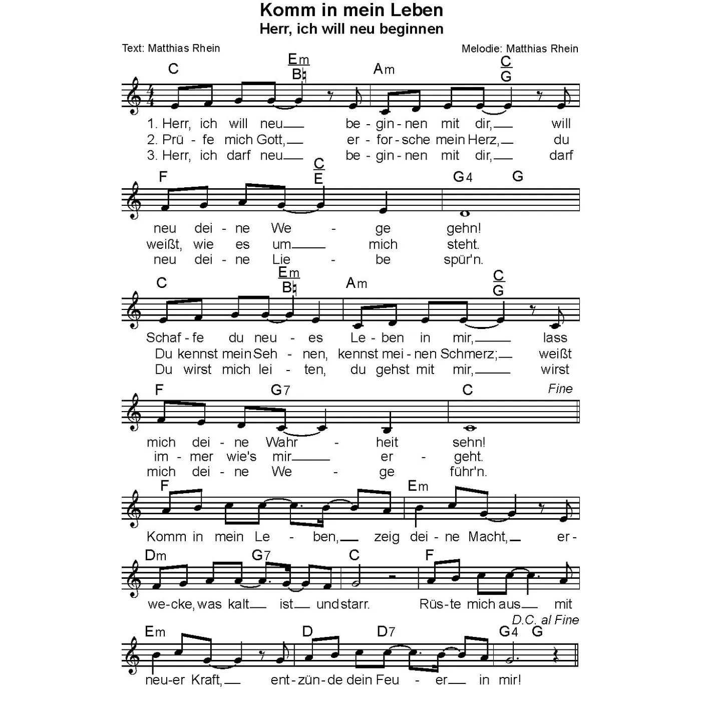Komm in mein Leben (diese Variante haben Sie gerade ausgewählt) (Kinderlieder, einstimmig, C-Dur, Andante (104), Viertel) Matthias Rhein (Text, Melodie) |