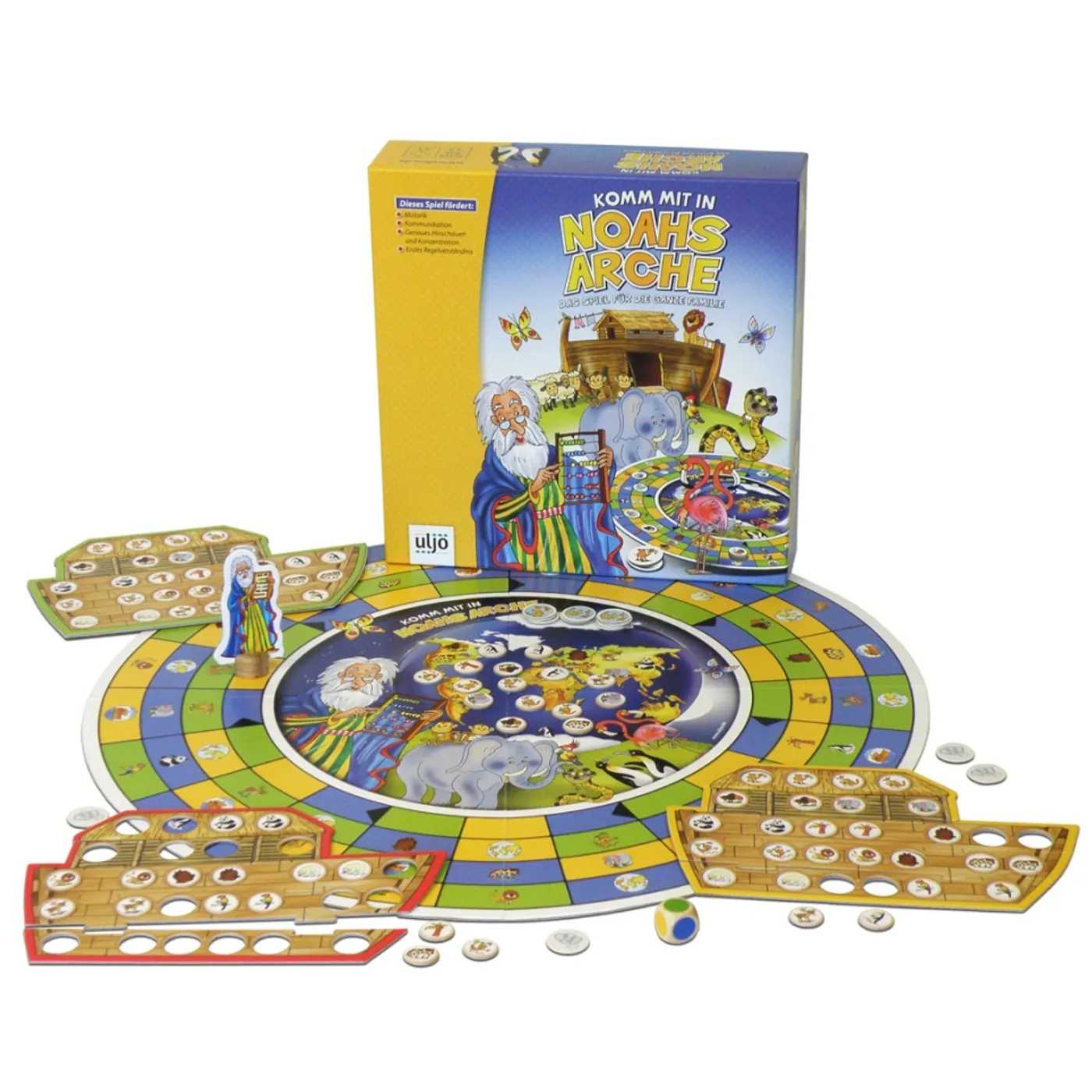 Ein lehrreiches Spiel für die Kleinsten rund um Noah, seine Arche und die Rettung der Tiere. Im Spielverlauf müssen über den außergewöhnlichen, runden Spielplan (Ø 58 cm) Tierpaare eingesammelt und auf die zusammengepuzzelten Arche gebracht werden.Umfangreiches Spielmaterial bringt spannenden Spielespaß und fördert erstes Verständnis von Regeln, Motorik, Konzentration und Kommunikation. Eine zusätzliche Memory-Spielvariante macht das Spiel attraktiv. Für 2 bis 4 Spieler von 3 bis 9 Jahren.