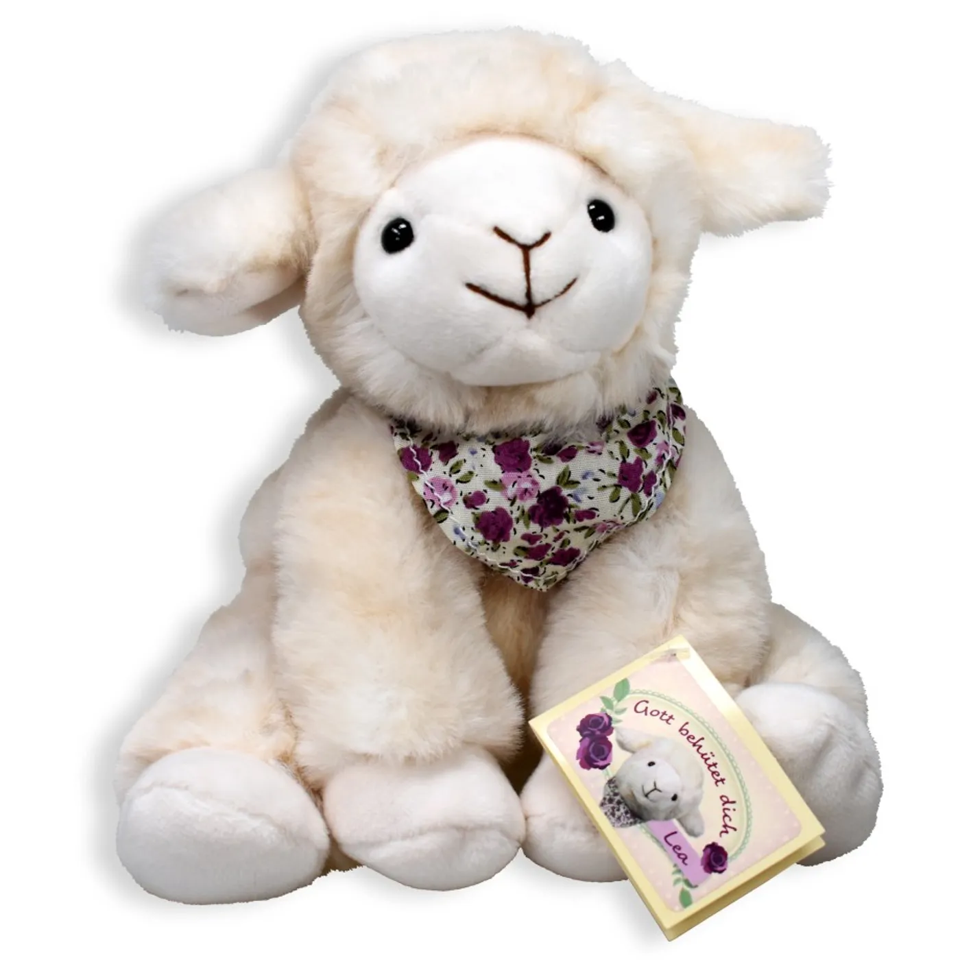 Sitzdes Schäfchen "Lea" aus flauschig weichem Plüsch, mit buntem Halstuch, getestet nach EN71, ca. 16 cm, handwaschbar bei 30°C, mit Geschenkanhänger "Gott behütet dich".