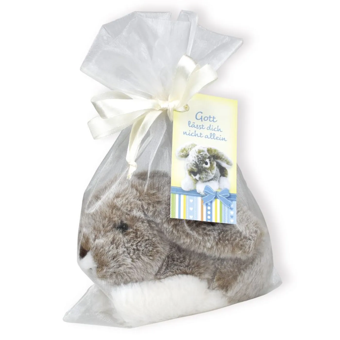 Hase aus kuscheligem Plüsch, 100% Polyester, ca. 15 cm, handwaschbar bis 30°C, im Organzabeutel mit Etikett "Gott lässt dich nicht alleine" , zertifiziert nach EN71.