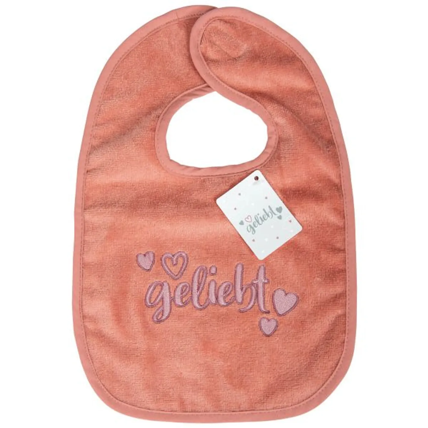 Das Baby-Lätzchen mit hochwertiger Stickerei "geliebt" und kleinen Herzen auf der samtigen Oberfläche ist ein liebevolles Geschenk zur Geburt oder Taufe.
