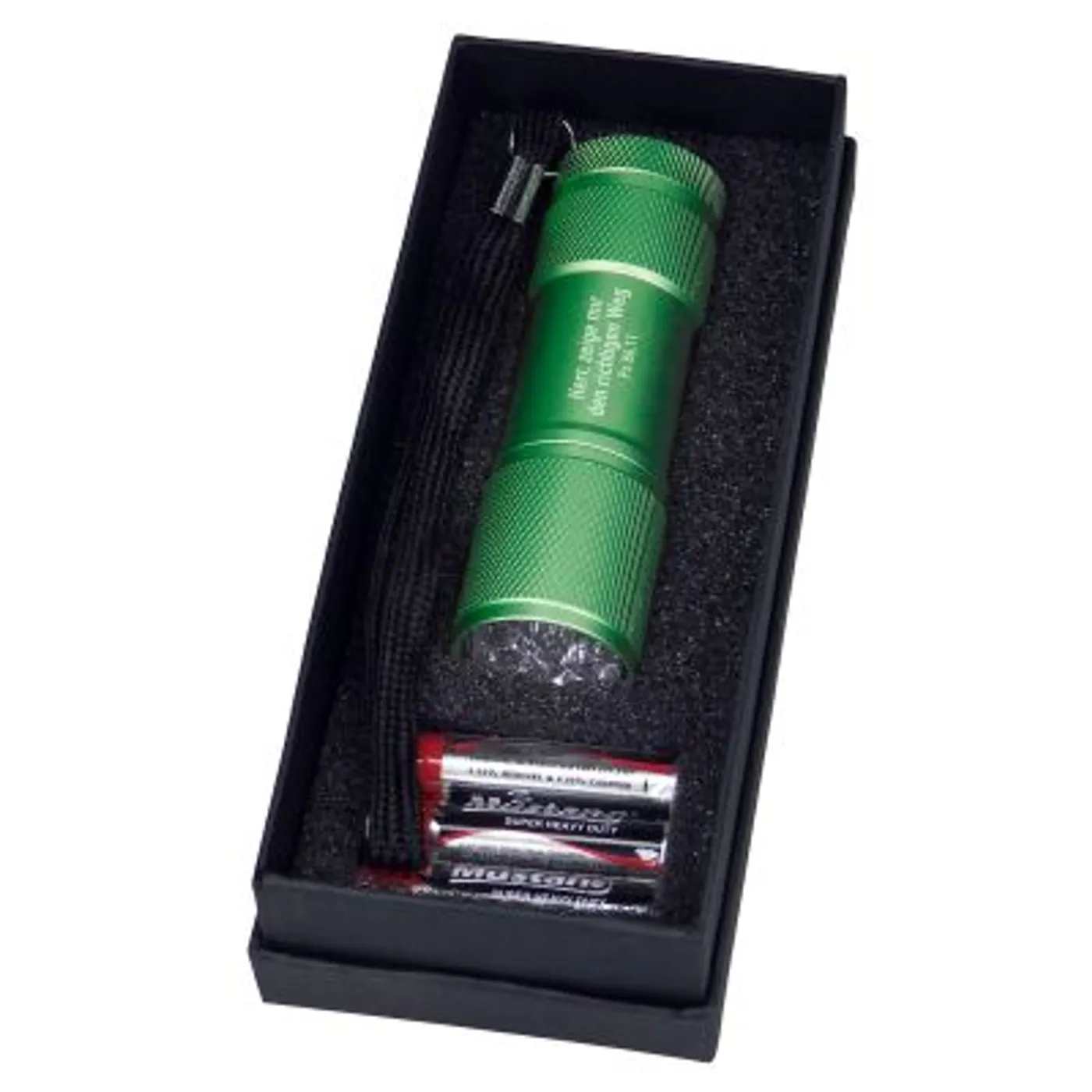 Aus Aluminium, mit Gravur, Handschlaufe, inkl. 3 AAA-Batterien, in Geschenketui