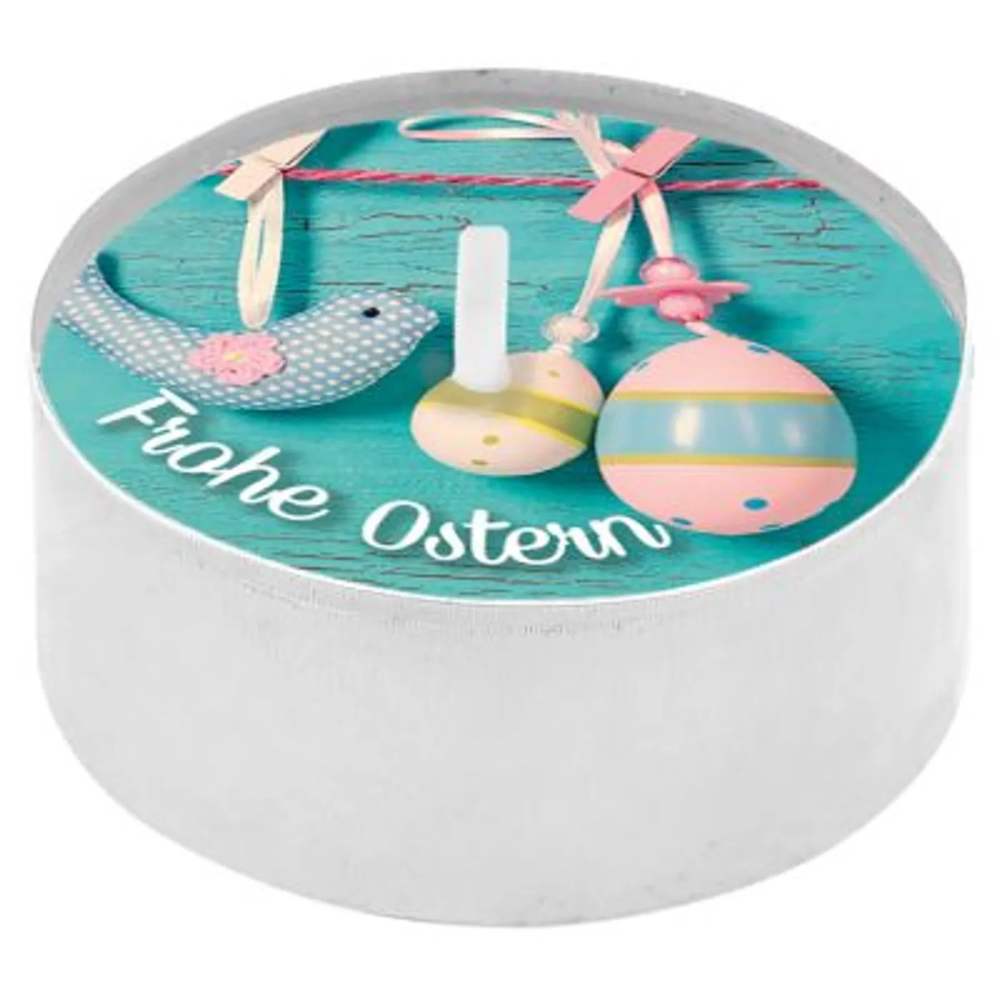 Text auf dem Teelicht: Frohe Ostern