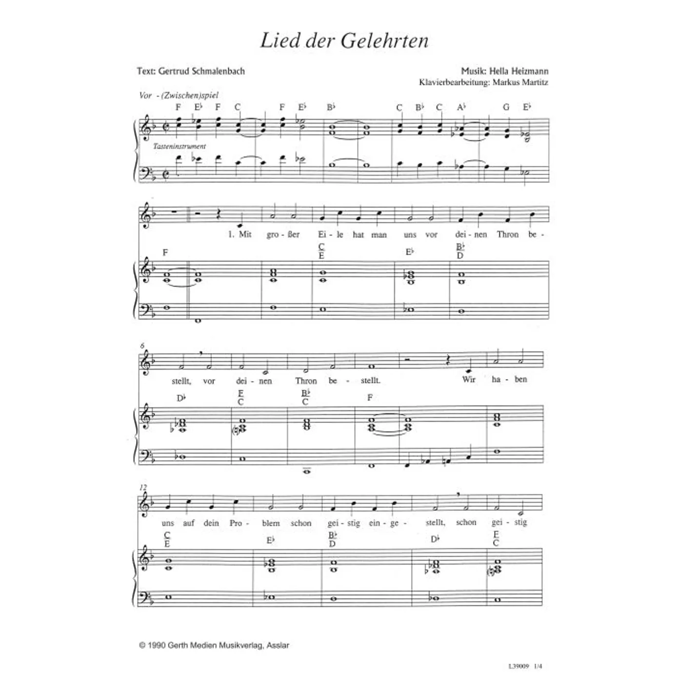 Lied der Gelehrten (diese Variante haben Sie gerade ausgewählt) (Klavier, einstimmig, mit Akkorden, F-Dur) Hella Heizmann (Komposition), Gertrud Schmalenbach (Text), Markus Martitz (Klaviersatz) |