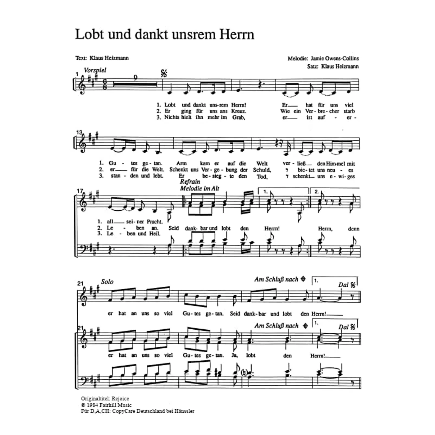 Lobt und dankt unserm Herrn (diese Variante haben Sie gerade ausgewählt) (Worship, Klavier, vierstimmig, A-Dur) Klaus Heizmann (Dt. Text), Jamie Owens-Collins (Text, Melodie) |