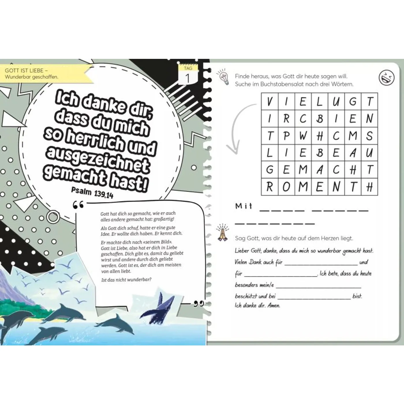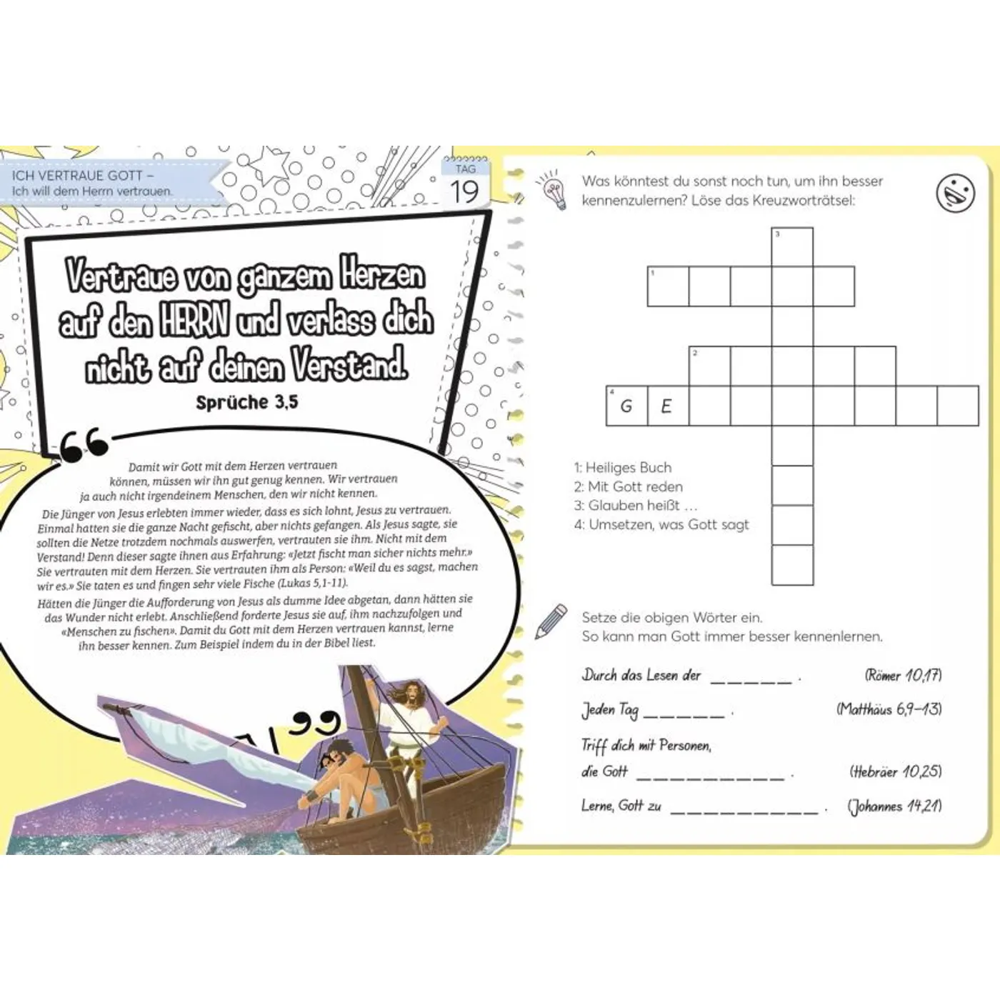 Zu jeder Andacht gibt es Rätsel oder andere Aktivitäten und du kannst die Seiten kreativ verzieren oder ausmalen. Du trägst diese Kreativität in dir. Weisst du warum? Weil Gott sie in dich hineingelegt hat!