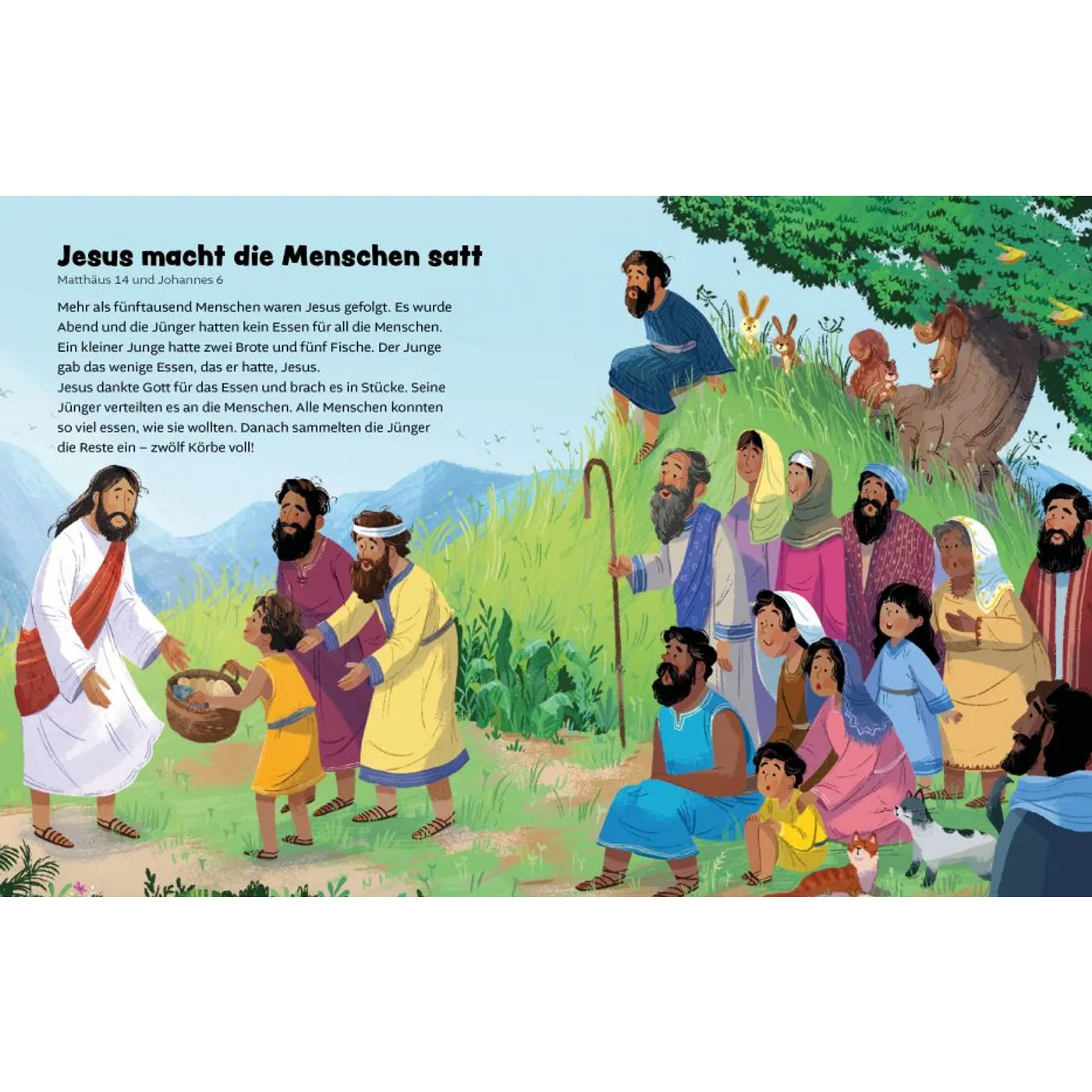 Auf den insgesamt 40 Seiten kann die junge Zielgruppe (Kinder ab ca. 4 Jahren) einige der bekanntesten Bibelgeschichten erleben. Jede Geschichte umfasst dabei eine Doppelseite, wobei die Texte an sich sehr kurz gehalten sind und sich auf das Wichtigste beschränken. Die Erzählweise ist einfach und kindgerecht. Die Geschichten eignen sich gut zum Vorlesen. Ein begleitendes, liebevoll gezeichnetes Bild ziert die Doppelseite und bietet aufgrund zahlreicher Details Einiges zum Entdecken.