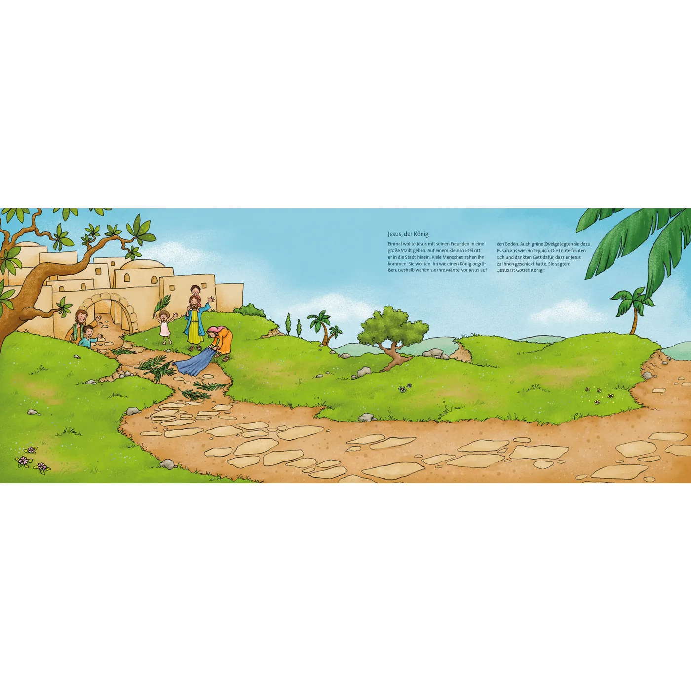 Es umfasst eine Rätselseite und vier Doppelseiten mit kurzen Bibelgeschichten von Jesus. Das Gleichnis über den guten Hirten, der Einzug Jesu in Jerusalem, die Auferstehung und die Himmelfahrt.
