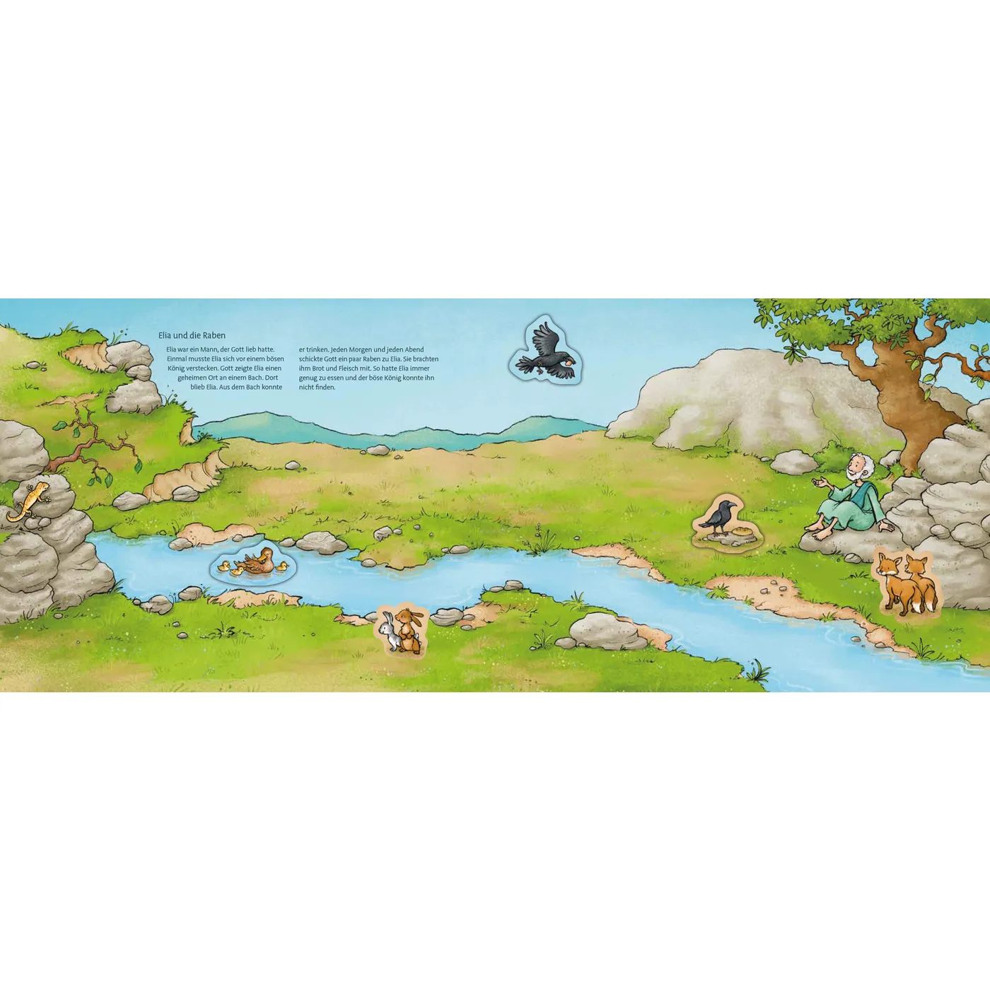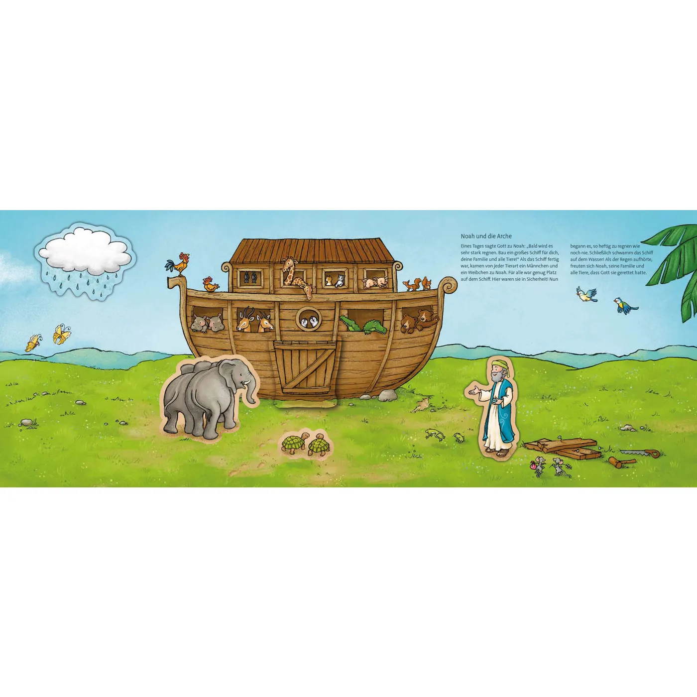 Dieses schöne Kinderbuch bietet den Kleinsten die Möglichkeit auf vier Doppelseiten diese tolle Bibelgeschichten neu zu entdecken nachzuspielen: die Schöpfung, Noah und die Arche, Elia und die Raben, Jona und der Wal. Auf der ersten Seite findet man zudem ein kleines Suchspiel.