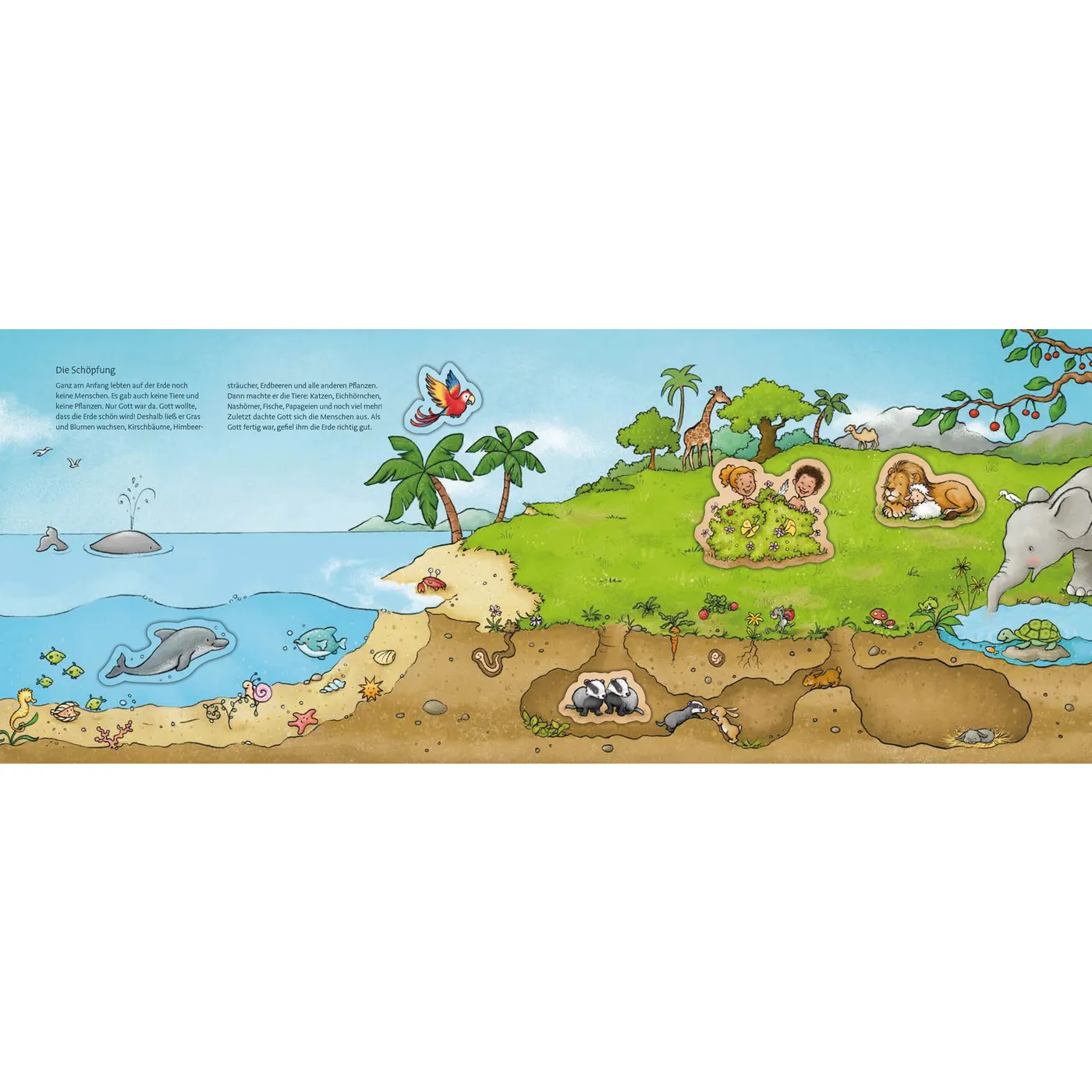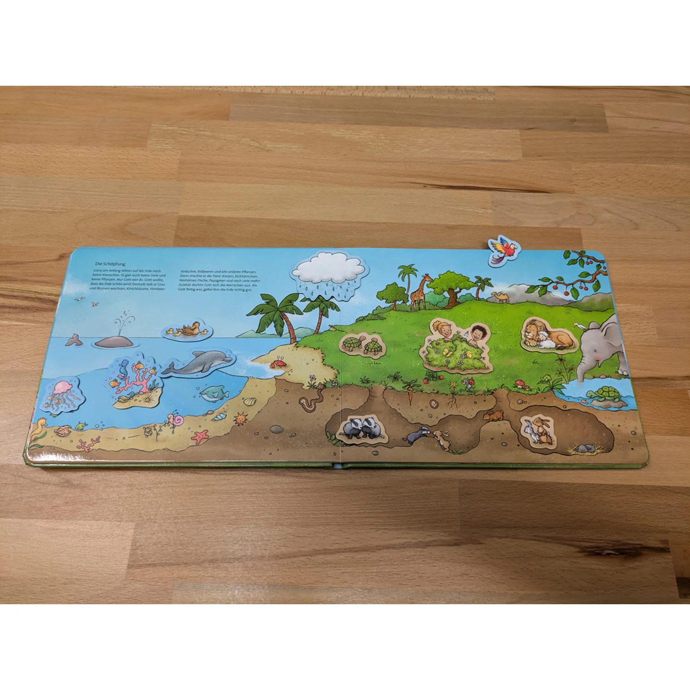 Auf jeder Doppelseite befindet sich ein kurzer Text, in dem auch kleine Hinweise zu den Magneten gegeben sind, z.B. „Zuletzt dachte Gott sich die Menschen aus“ (Magnet Adam und Eva) oder „Bald wird es sehr stark regnen“ (Magnet Regenwolke).