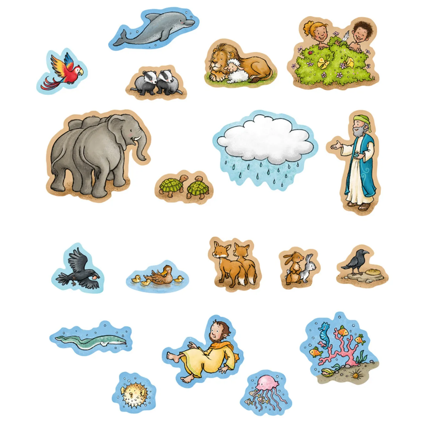 Mit 20 verschiedenen Magneten (z. B. verschiedene Tiere, Adam und Eva, Noah, eine Regenwolke etc.) lassen sich die Geschichten immer wieder neu veranschaulichen. Die Figuren haften auf den magnetischen Buchseiten und können nach dem Spielen ganz einfach wieder in der durchsichtigen Box vorne verstaut werden.