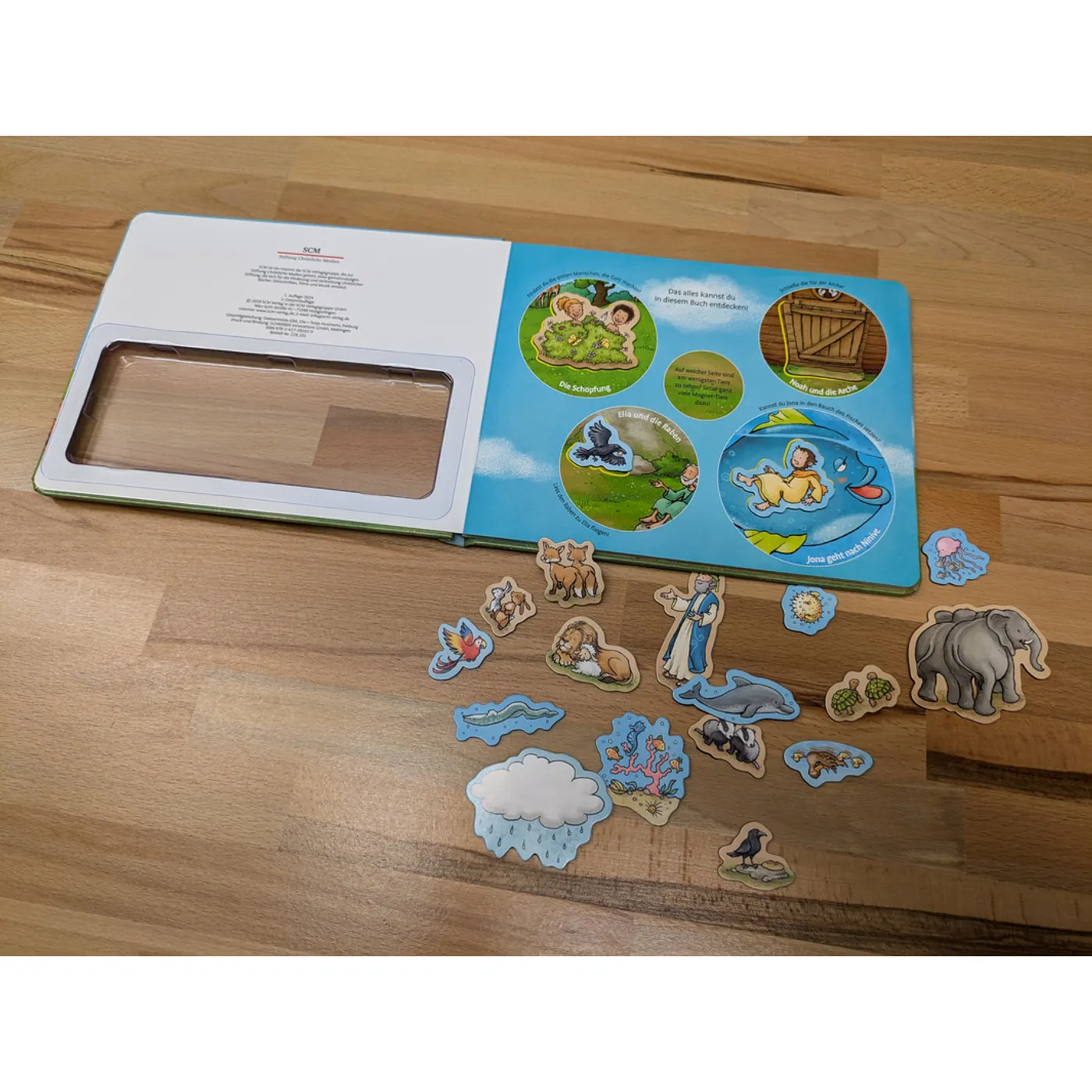 Das Magnetbuch über Tiergeschichten aus der Bibel ist im Querformat und hat ein durchsichtiges Fach auf der Rückseite der Titelseite, in dem die 20 verschiedenen Magnete sind.